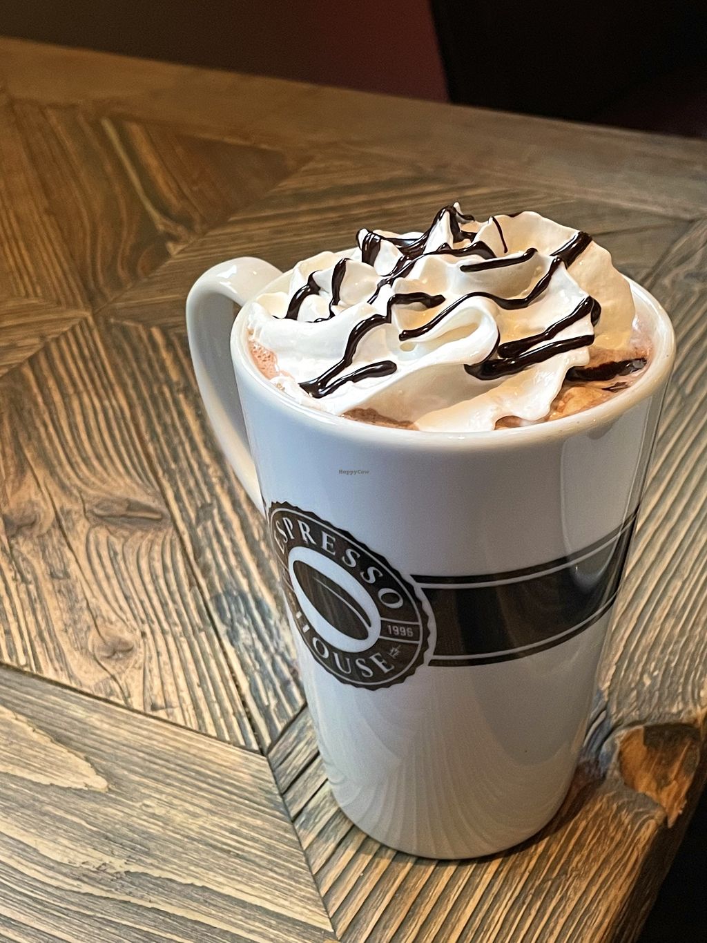 a few nice vegan options and clear labelling on what’s vegan😄they have oat, soya and coconut milk and they also do soy vegan whipped cream! lovely little cafe would recommend for any vegans looking for a quick coffee😄