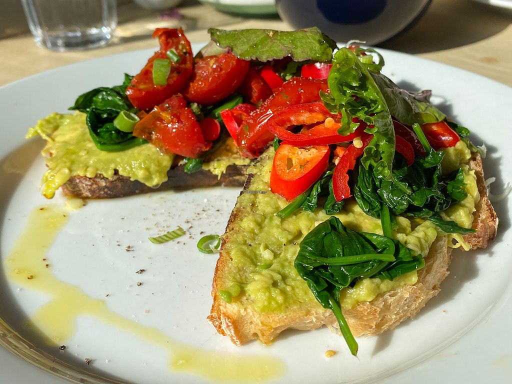 avocado toast with spinach, sundried tomatoes and chillies