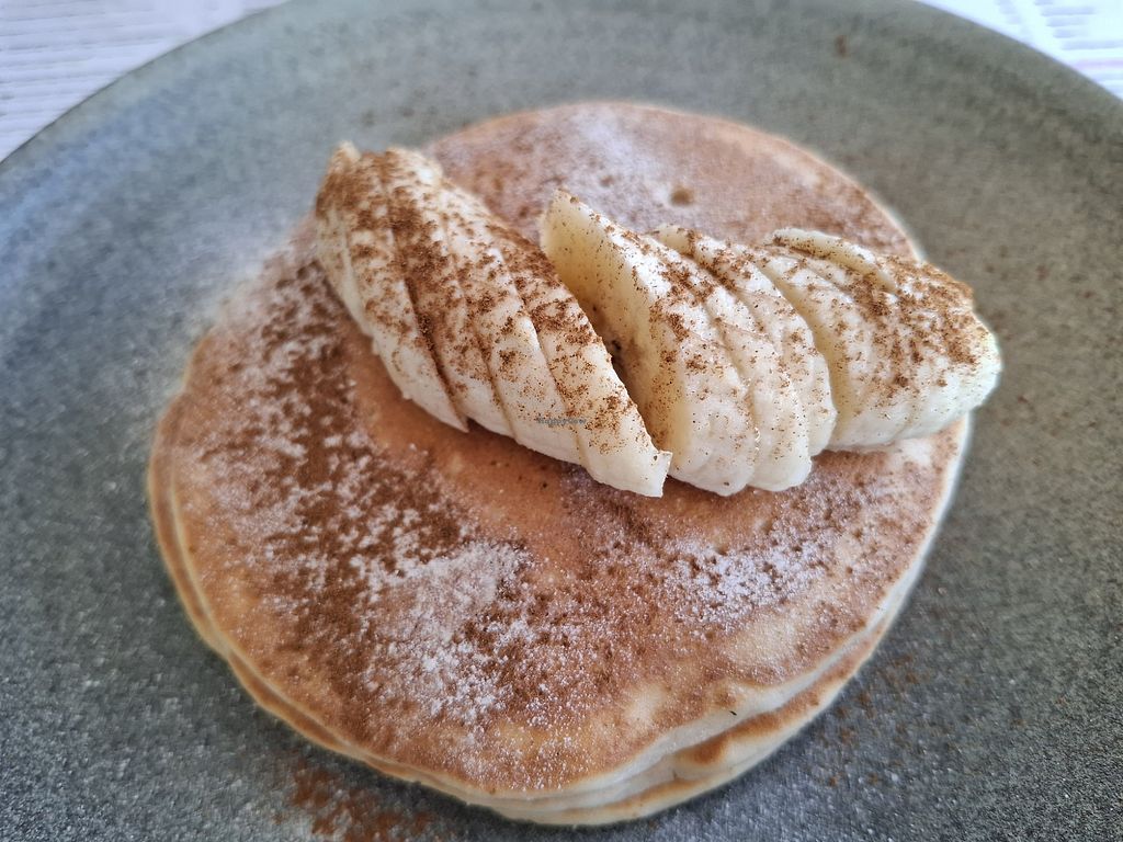 Vegan pancakes with bananas, maple syrup and cinnamon.