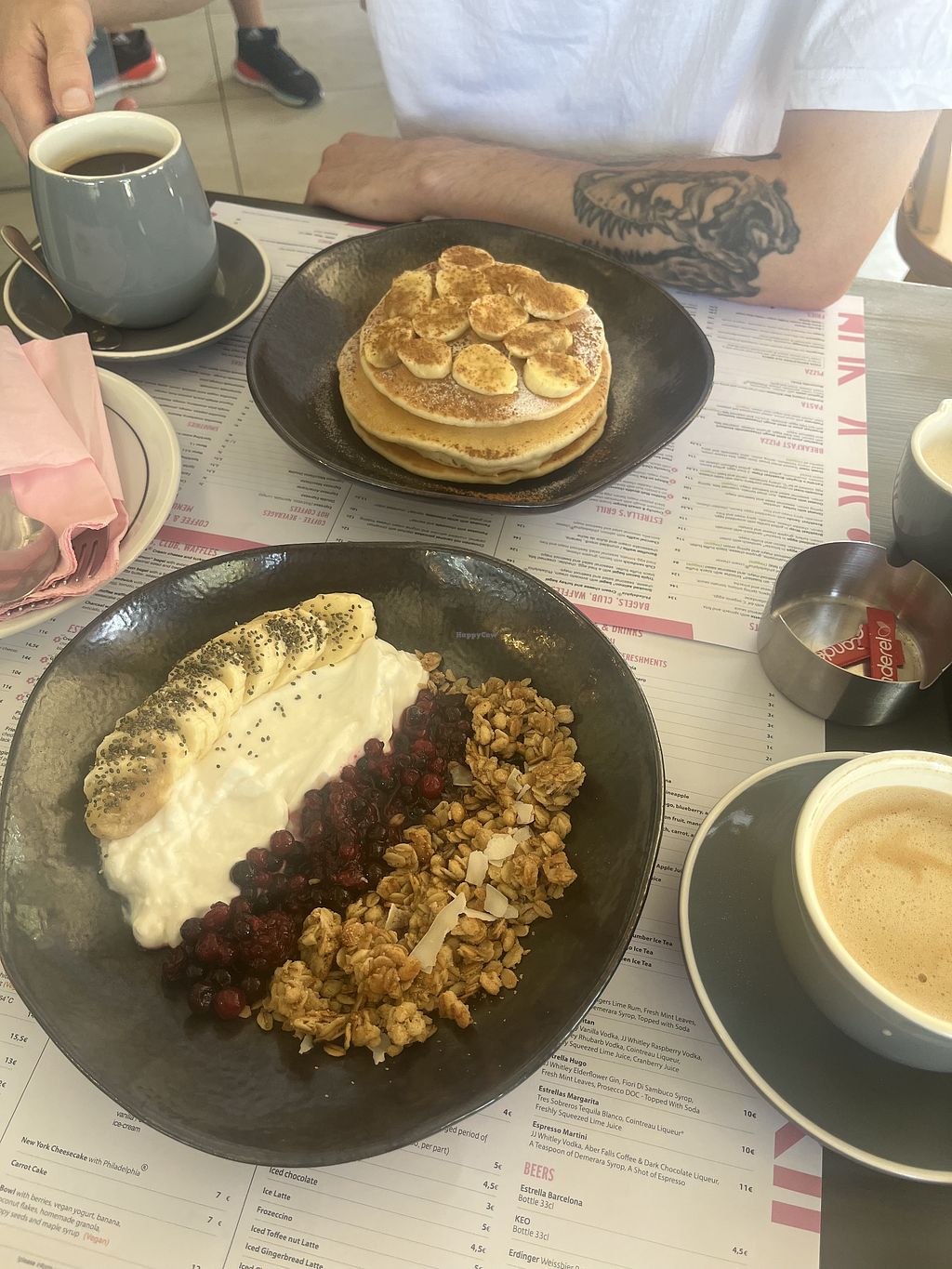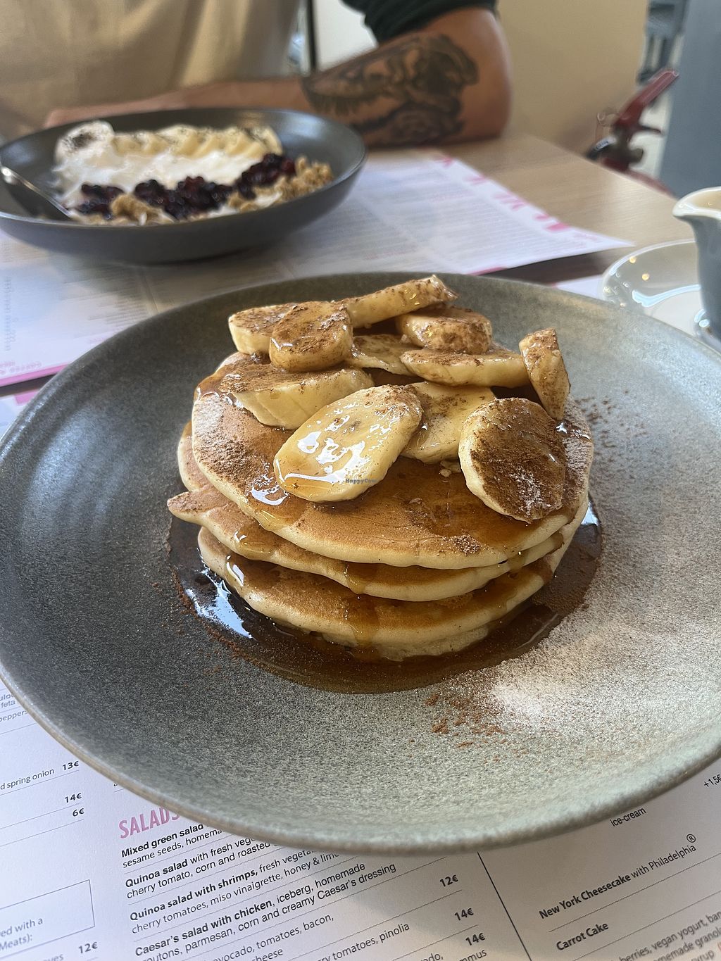 Vegan bowl and cinnamon and banana pancakes