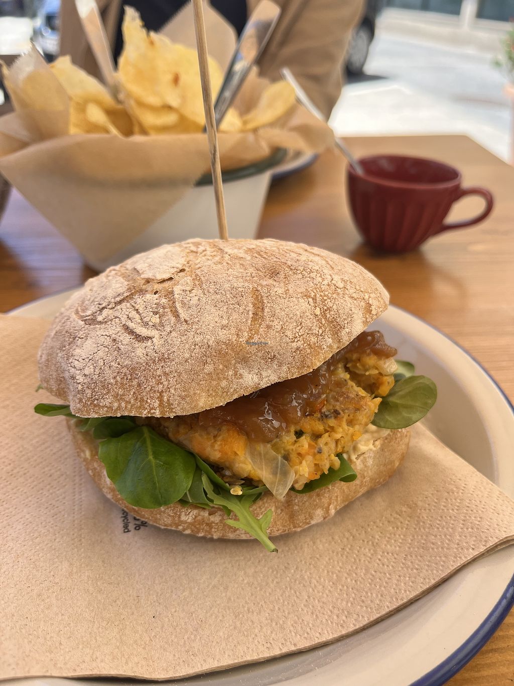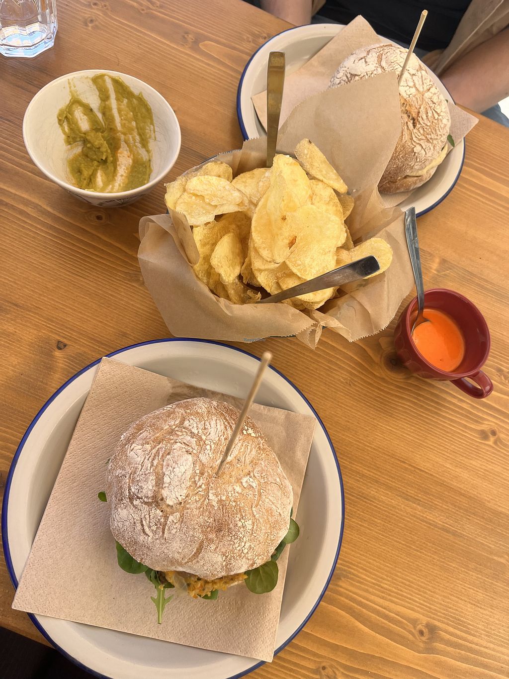Vegan burger with potato fries and red sauce. Guacamole with crackers …