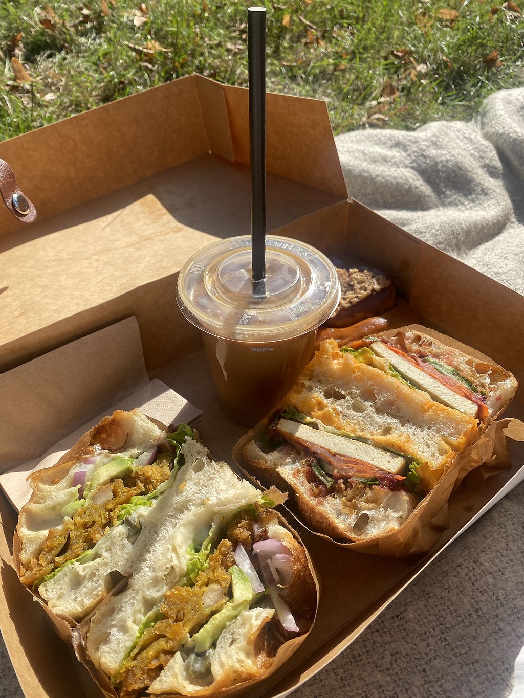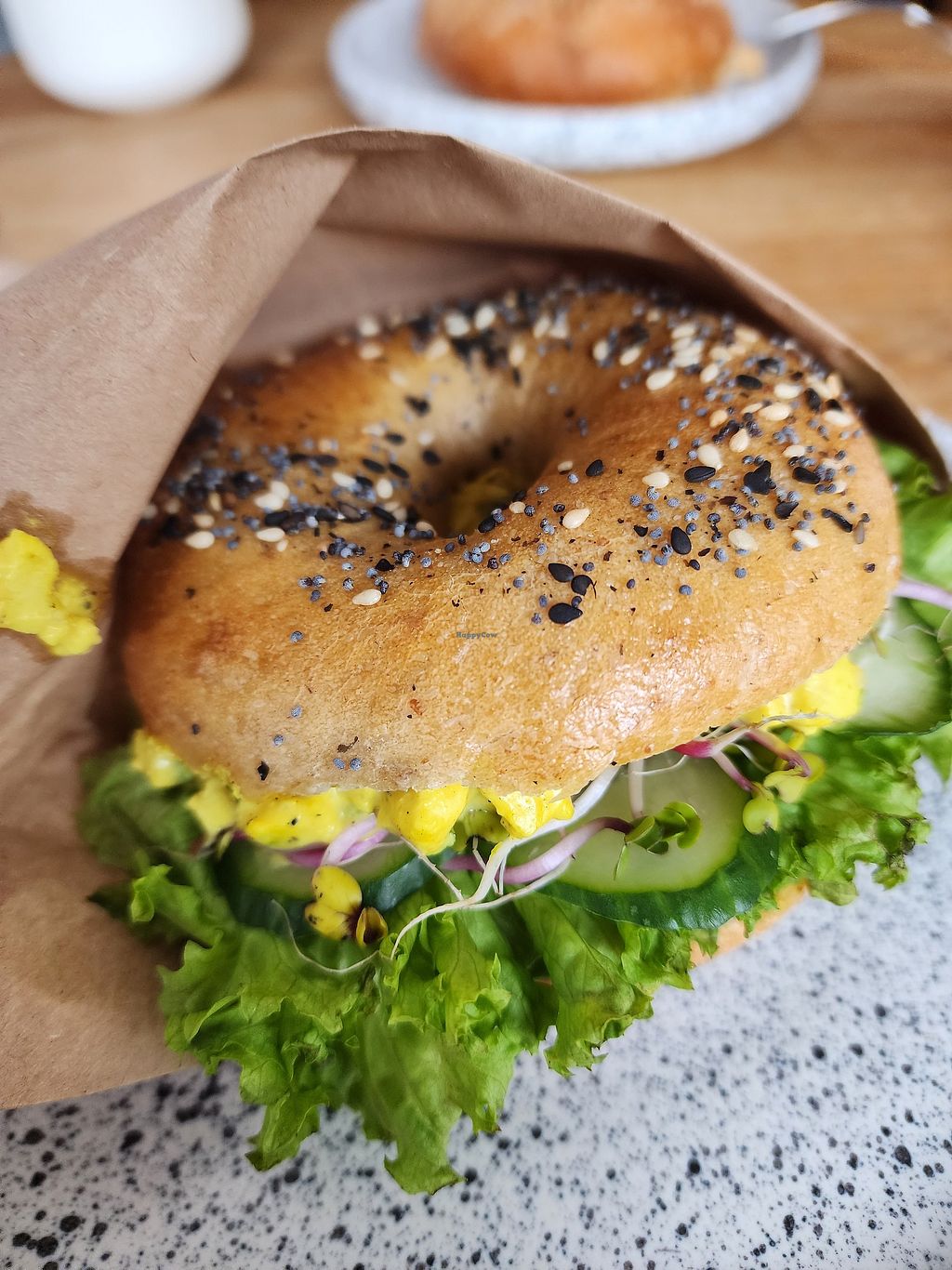 The food was fresh and delicious, with seasonal flavors like apple, chai, and pumpkin. The tofu "egg" salad bagel sandwich was very tasty, and we also tried a cherry pastry that was really good. Enjoyed their brewed coffee.