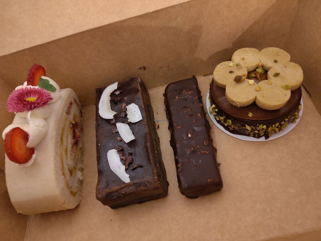 Tasty vegan desserts, looking like art. Really nice cozy cafe.