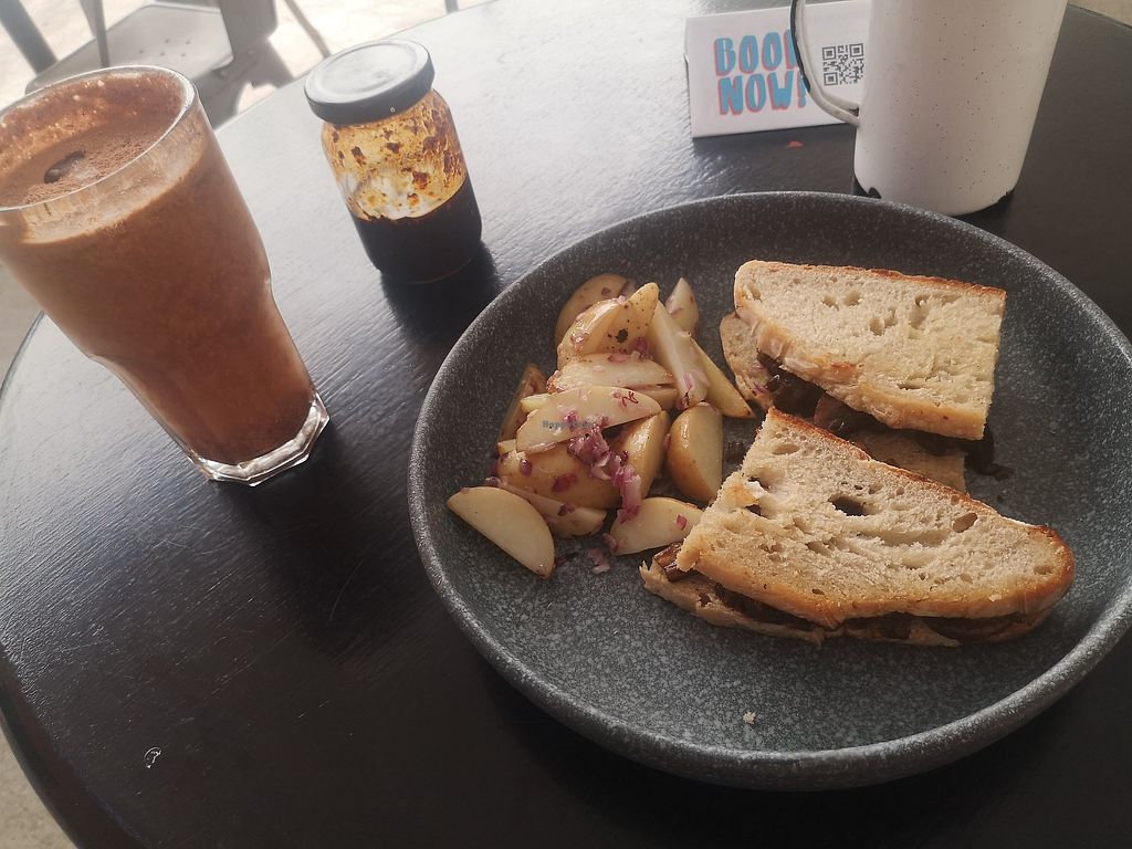 Good food, I got the mole sandwich which was good but essentially only contained mushrooms which I found a bit dissapointing and uninspiring for a vegan place. The cocoa horchata was delicious! It's surrounded by other local shops and artist studios, so very nice ambience.