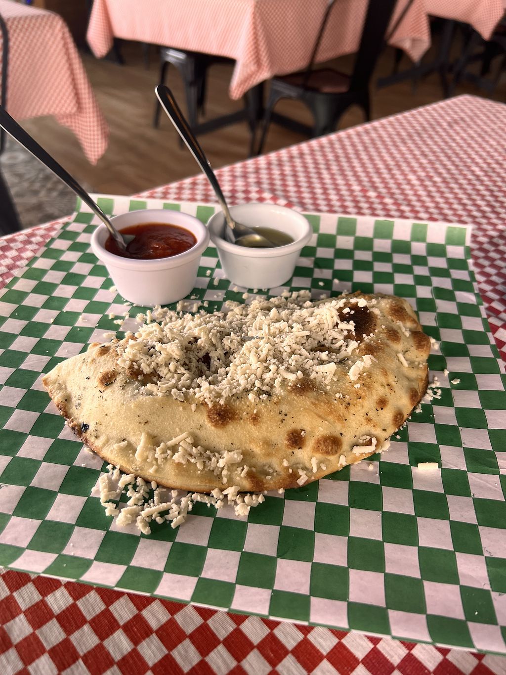 Serves meat, vegan options available. Italian restaurant offering a selection of vegan pizza and calzone options. Open Mon-Sat 1:00pm-12:00am, Sun 1:00pm-11:00pm.