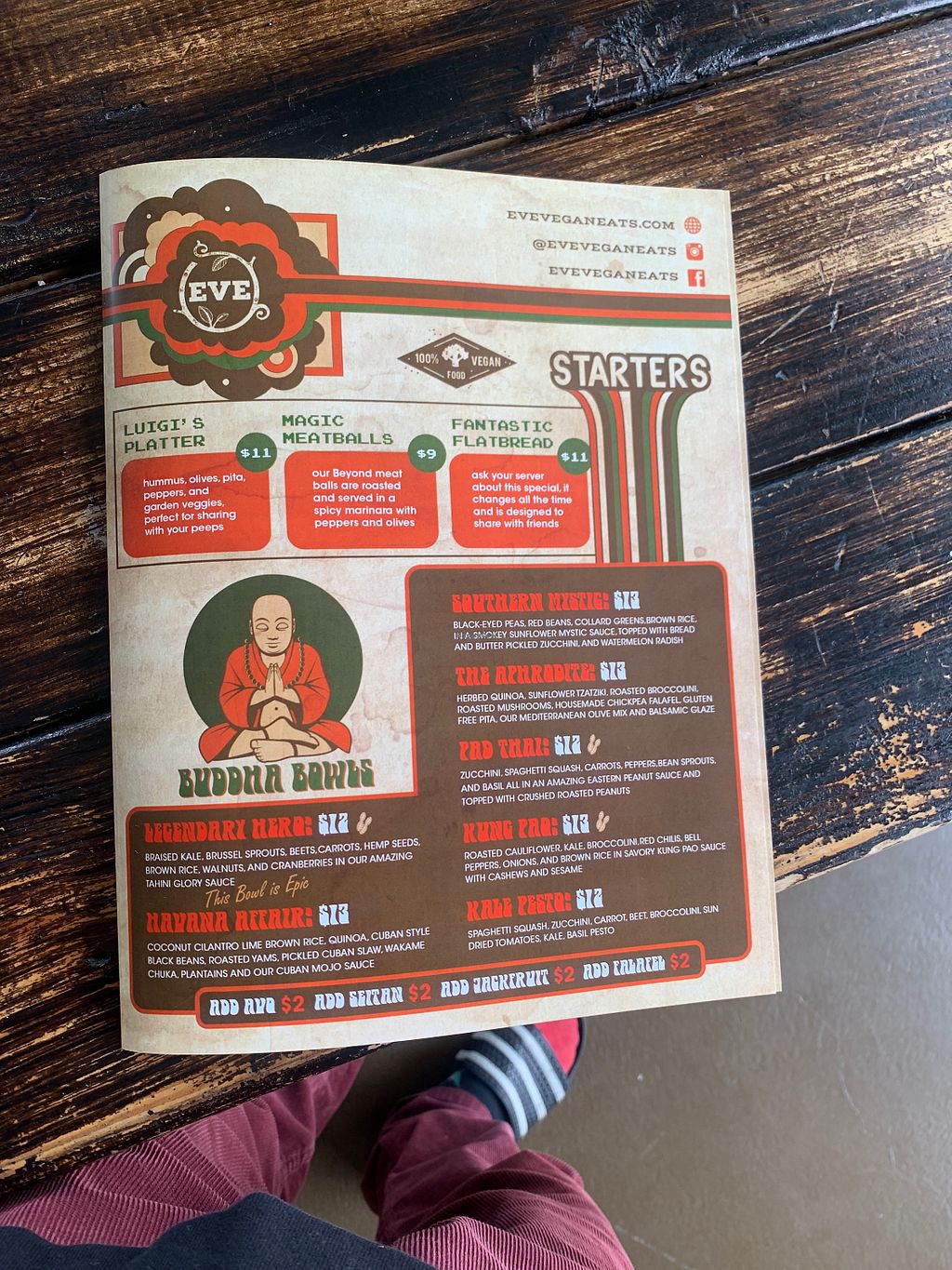 I came across Eve by chance while looking for a place to stop on the drive down to San Diego. I was pleasantly surprised by the extensive menu full of delicious-sounding vegan dishes and was not let down with the food I ordered. I got a great bowl of veggies in a spicy asian sauce (don't remember what it was called). I did not have a chance to try other things on the menu but the burgers and flatbreads that I saw other tables order looked really amazing. Definitely stop by Eve for a solid vegan meal.