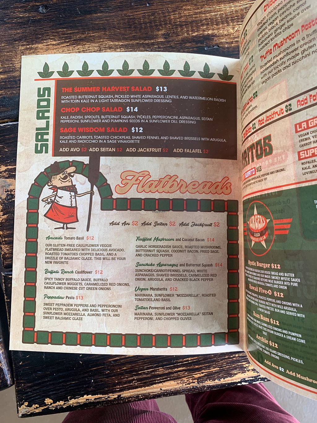 I've been here twice and enjoyed my stay greatly. Reading the menu was already quite entertaining as there are so many different flat breads, burgers, burritos and salads to chose from. They have quite unique meals with variations like "seasoned beyond burger", "coconut bacon", mayo with different flavours, onion rings and so on.