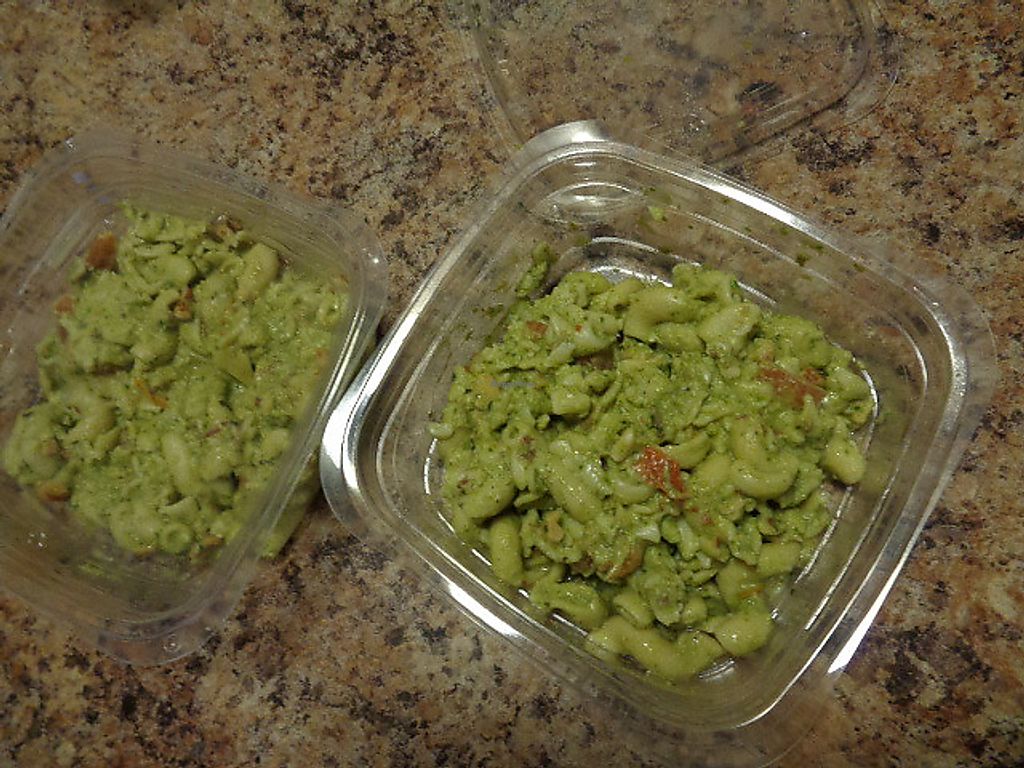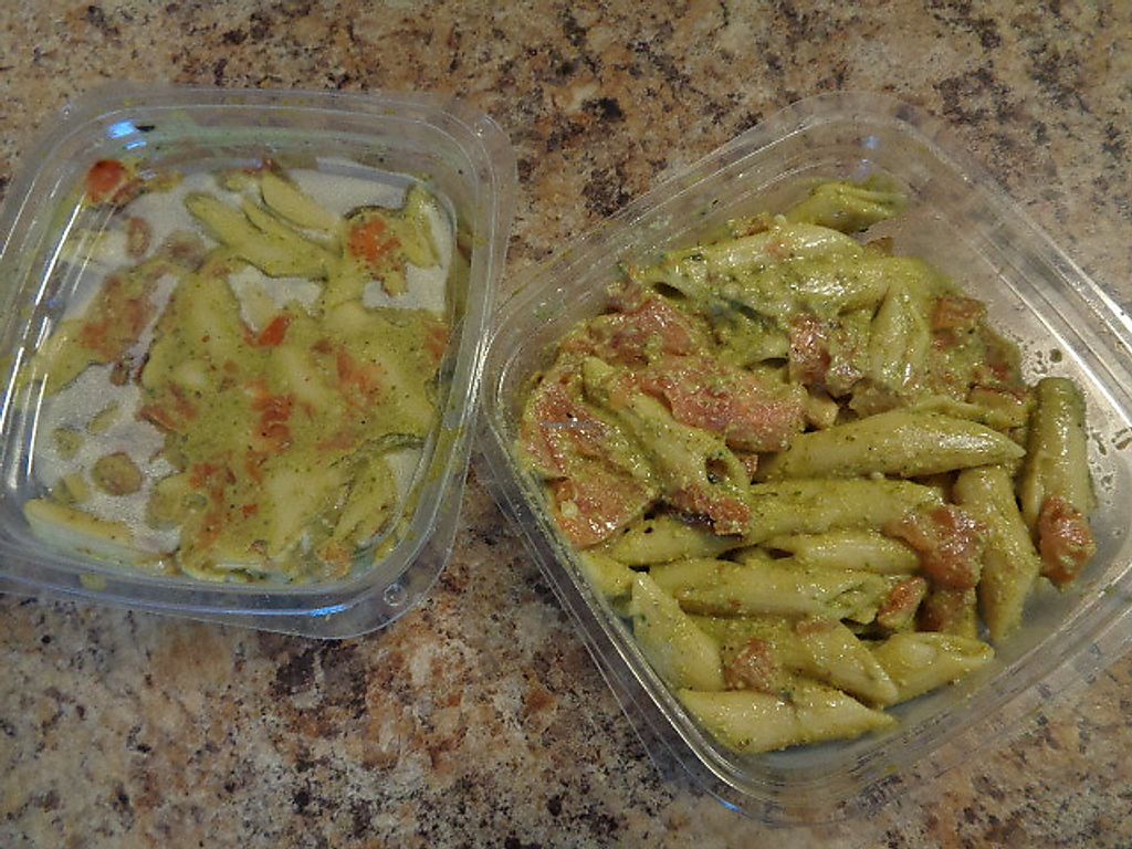 2 sides of pesto pasta salad, different pasta shape than last time and…