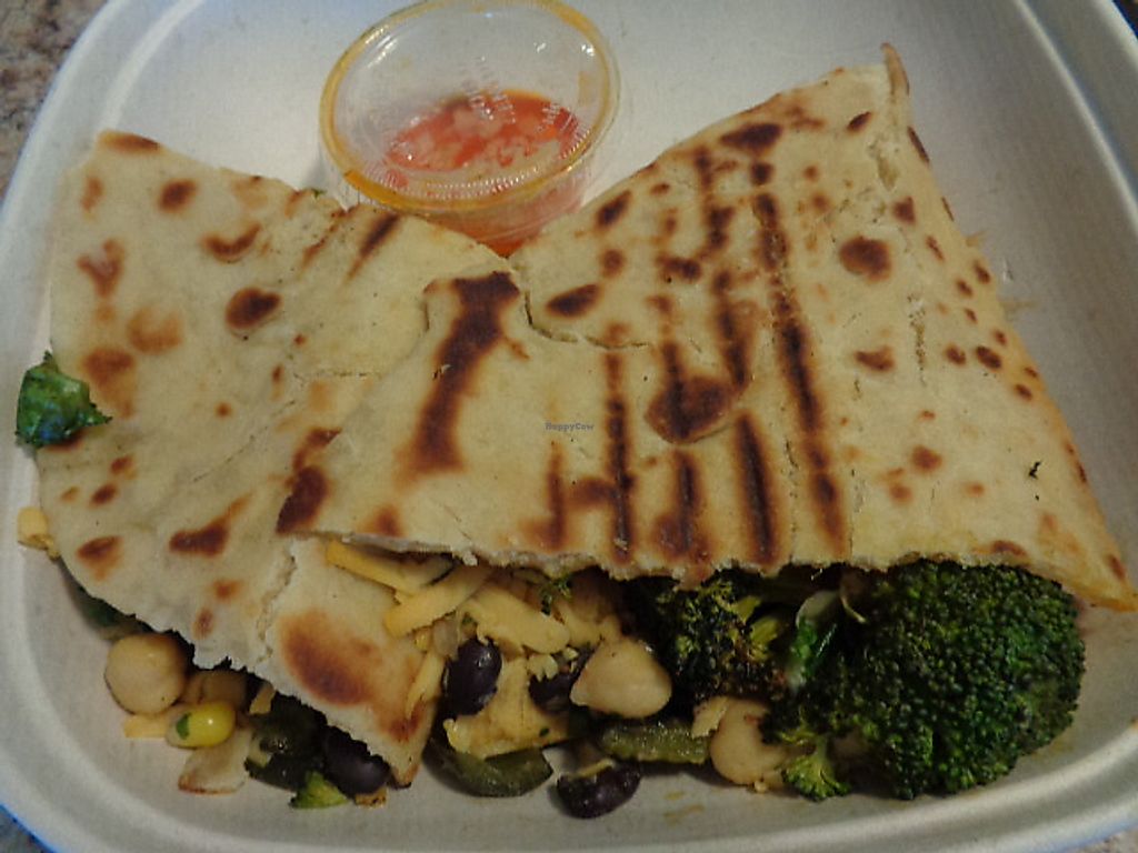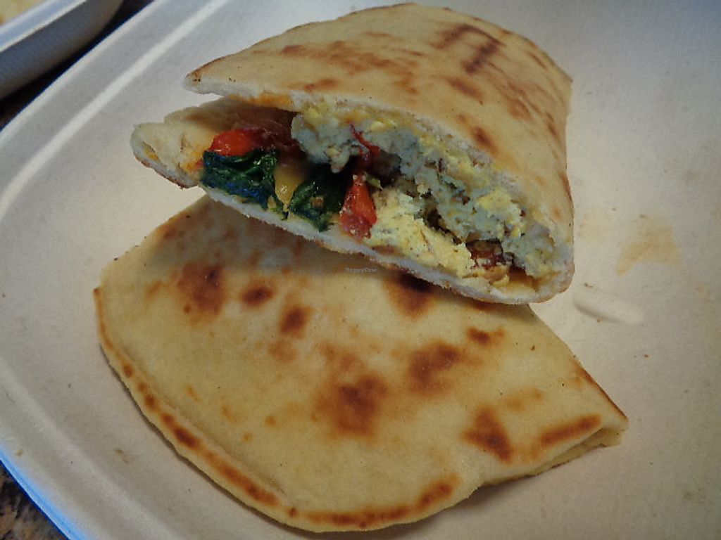 Vegan Morning Panini. Tofu eggs, sautéed spinach, roasted red peppers,…