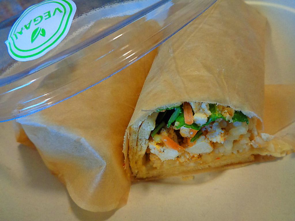 Veganized salmon cold wrap: roasted tofu, brown sushi rice, carrot, cu…