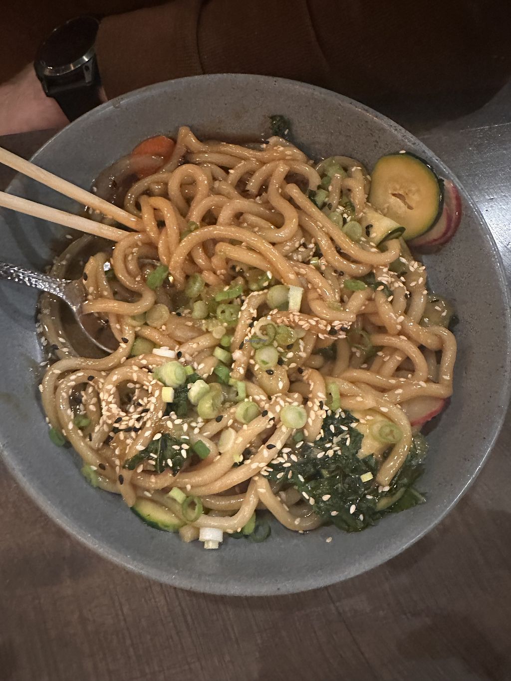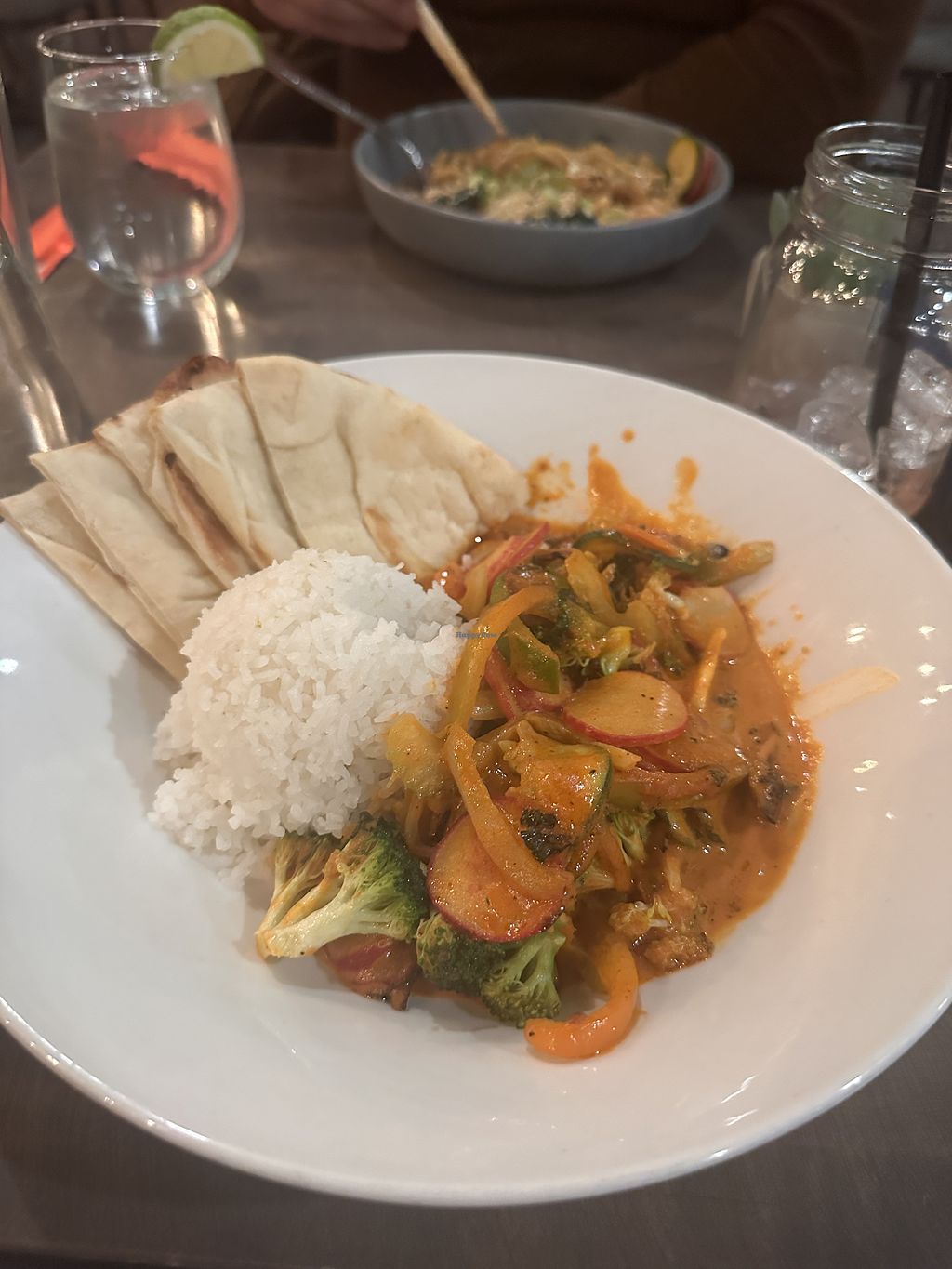 We had the teriyaki noodles and the red curry with naan and jasmine rice. It was delicious and was SO refreshing to not just be offered a burger or salad as the vego option. They had quite a few other dishes too! Recommend