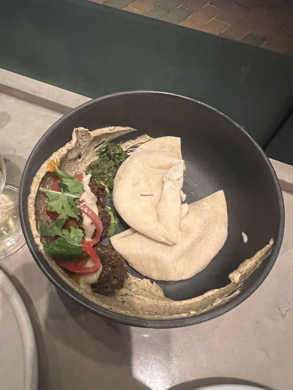 Serves meat, vegan options available. Mediterranean restaurant and wine bar. Has a vegetarian and vegan tasting menu option. Staff know about the ingredients and will assist and accommodate - just ask. Upscale atmosphere, overlooks a busy street. Open Tue-Thu 4:30pm-9:00pm, Fri-Sat 4:30pm-10:00pm. Hours may vary; call ahead.