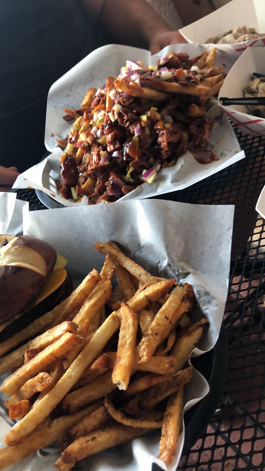 Foreground: dog with jackfruit bbq. Note the soft pretzel bun in back…