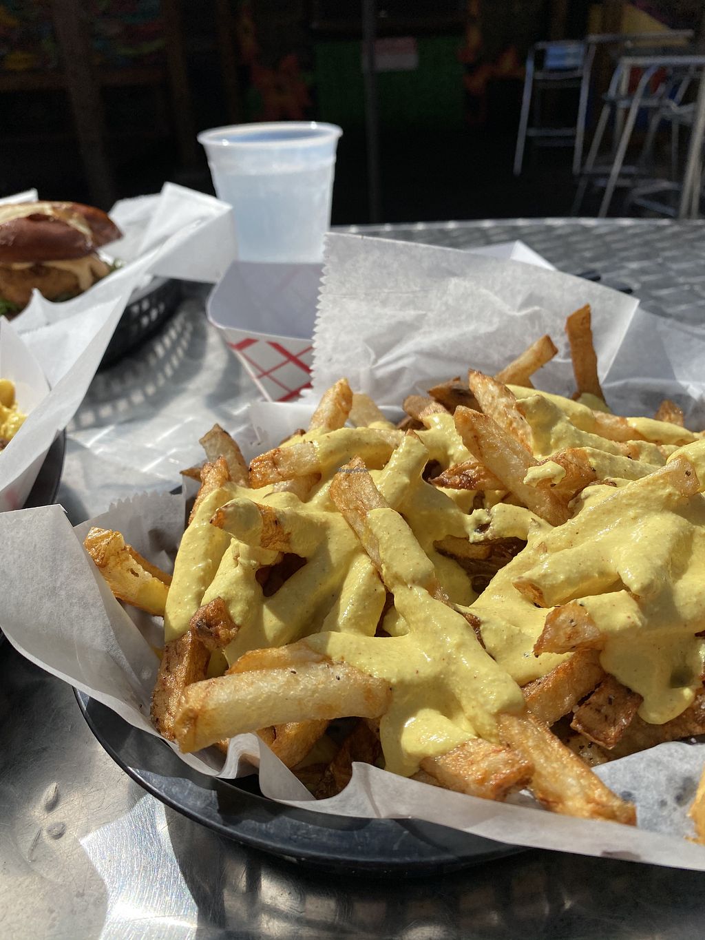 Philly Mac and cheese with cheesy fries and chick’n sandwich