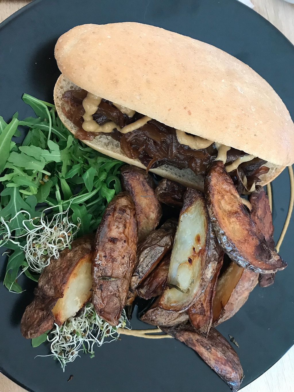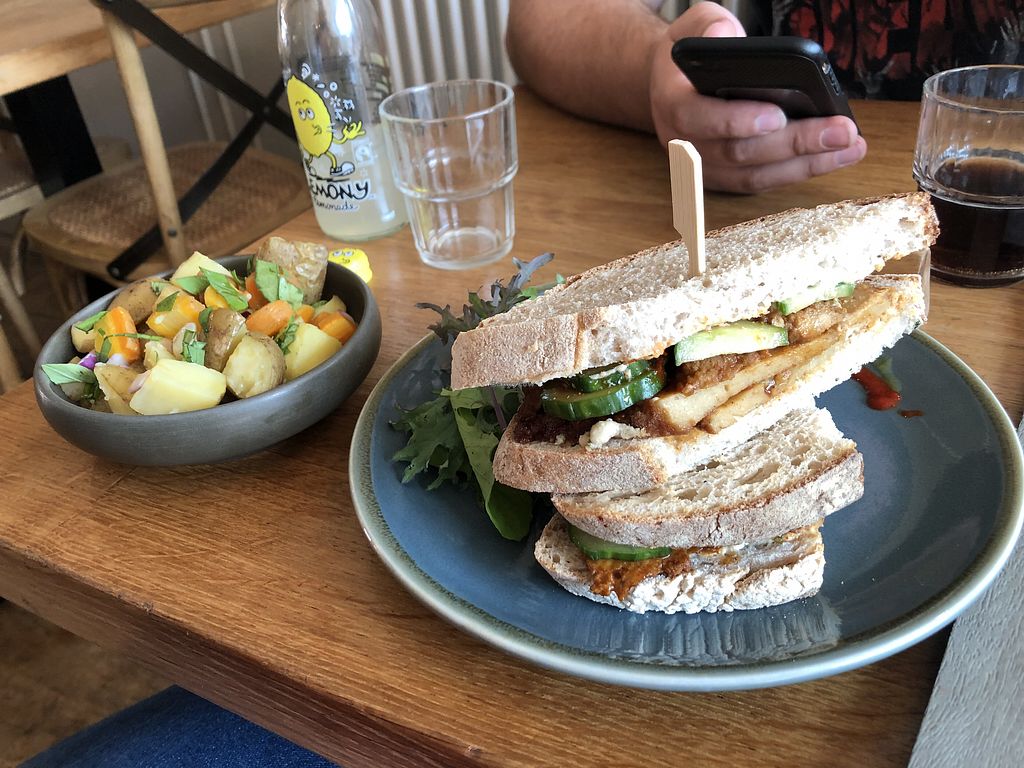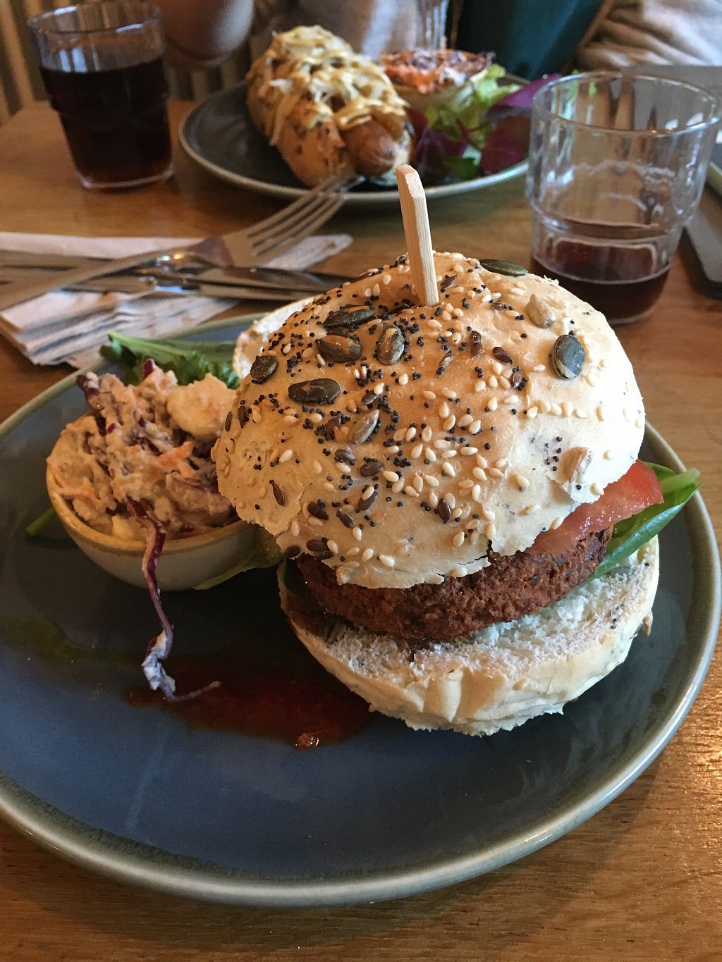 We went there for afternoon tea and cake and they had a lot of selection of both drinks and vegan cakes, including some really good gluten free ones. We couldn't tell they were gluten free, which is pretty impressive. We then went back for dinner and had the burger and pizza. These were okay, the burger was very nice and the potato wedges were lovely. The pizza was less good as their cashew cheese was just in lumps on the pizza and did not melt or taste very cheesy. Overall a great cafe which almost everything vegan. They did have a buffet for hot food and salad which looked pretty good but we did not try that.