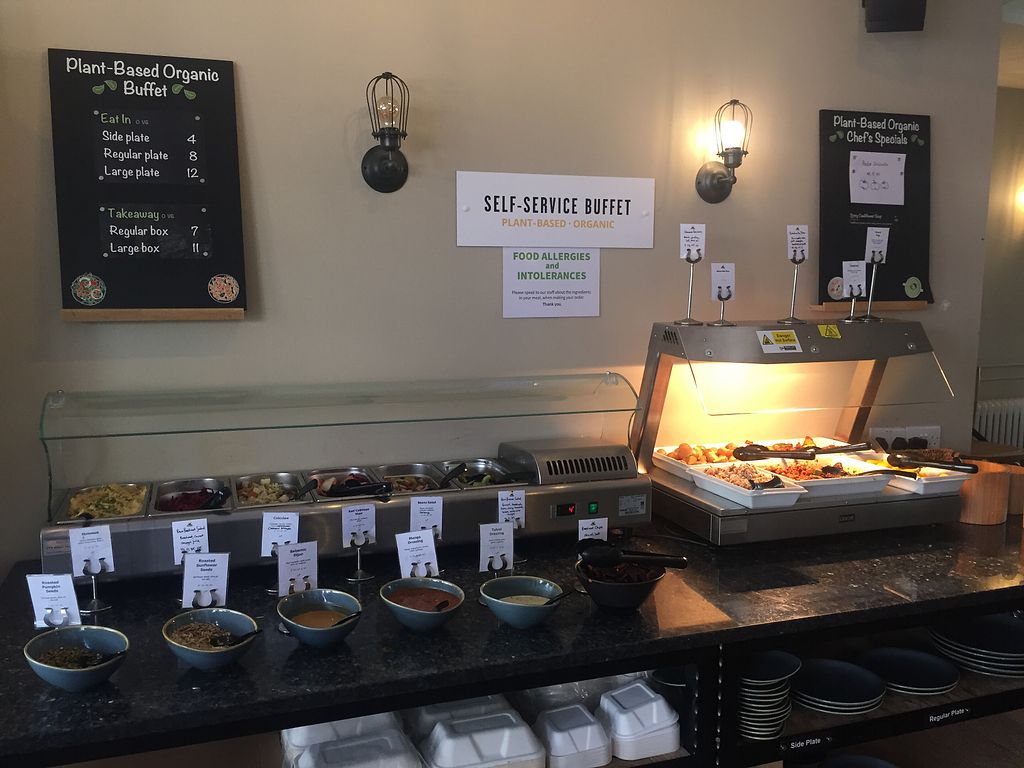 Expensive vegan restaurant with buffet by weight and menu options. Buffet by weight very expensive as is the soup at £7 and you have to pay for bread extra.