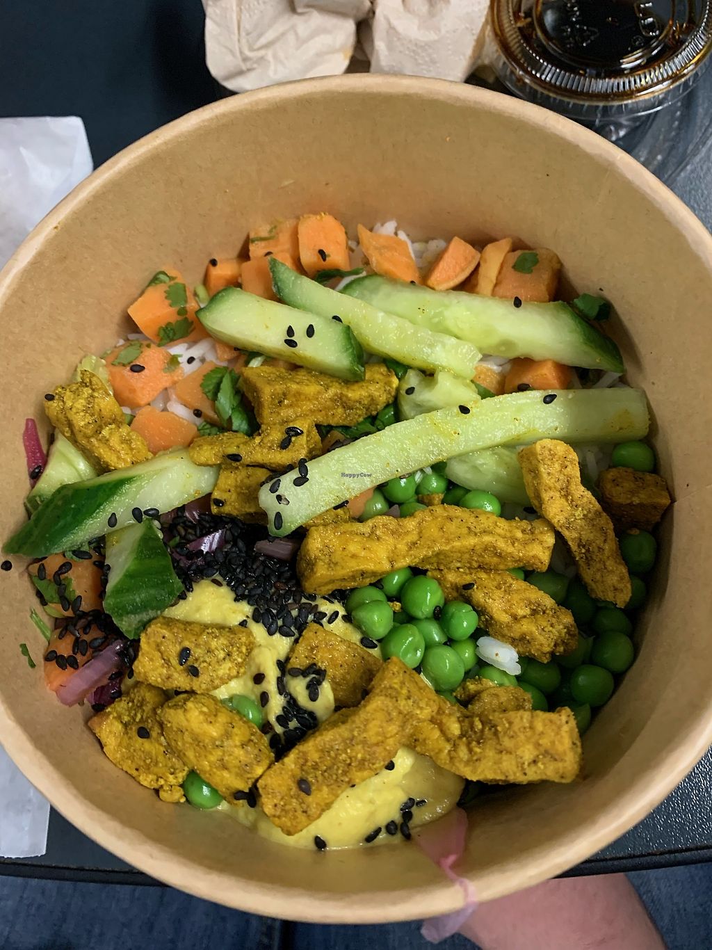 We sat in for some hot drinks and got some food to take away for later on the train. We got the pink energy bowl (red lentils and jasmine rice, beetroot hummus salad & cashew nuts) and the Indian vegan bowl (jasmine rice, tofu, sweet potato, yellow curry vegetable). Both really good and came with bread, sauce and balsamic/olive oil bottle. Vegan options were clearly labelled and there were some other salads and soups available too.