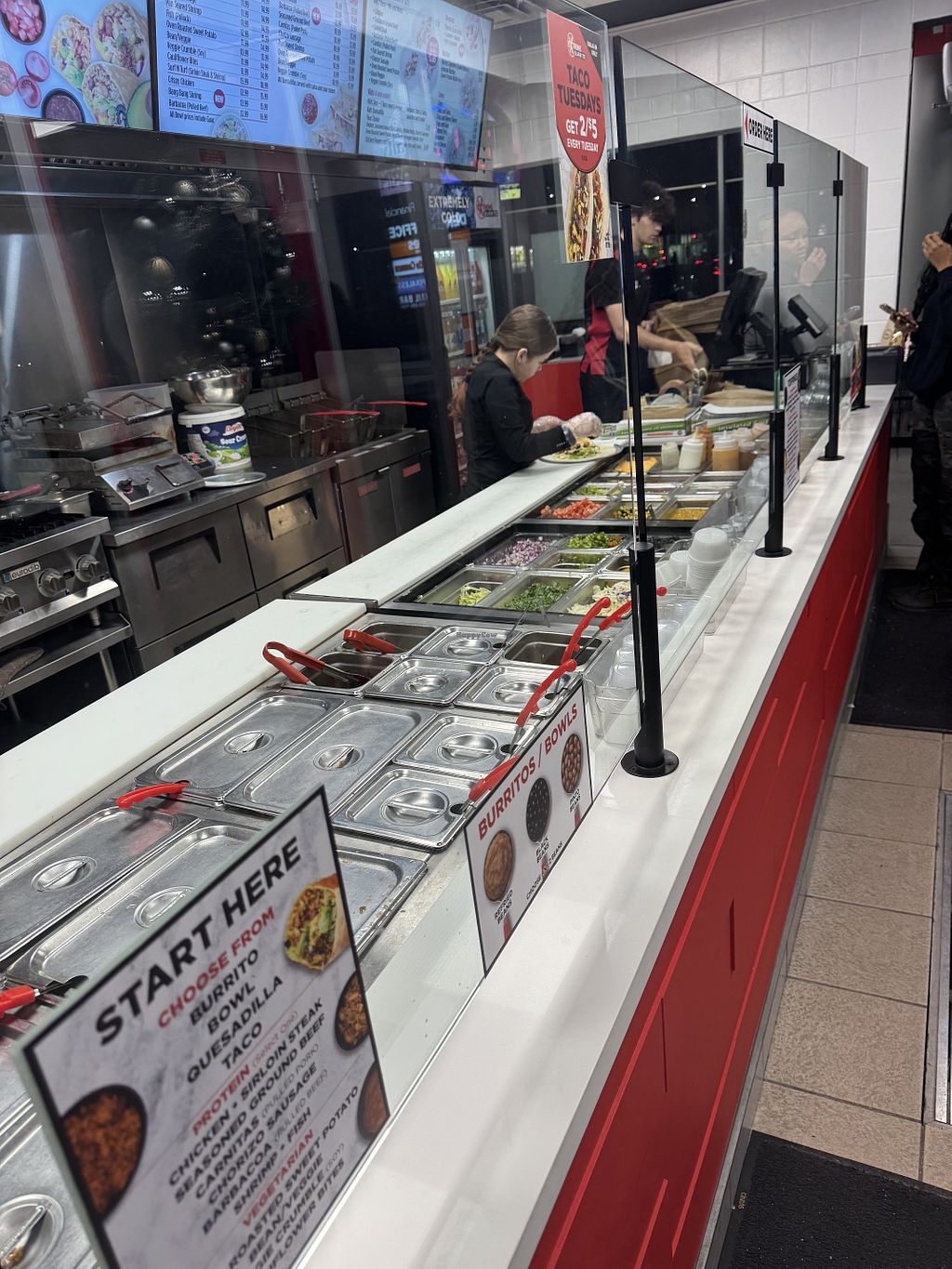 Serves meat, vegan options available. Tex-Mex spot offering veganizable options like bean/veggie burrito (beans, rice, vegetables), cauliflower bites burrito, veggie crumble (soy) tacos (plant-based mince), and veggie bowls. Open Mon-Thu 10:30am-11:00pm, Fri-Sat 10:30am-12:00am, Sun 10:30am-11:00pm.