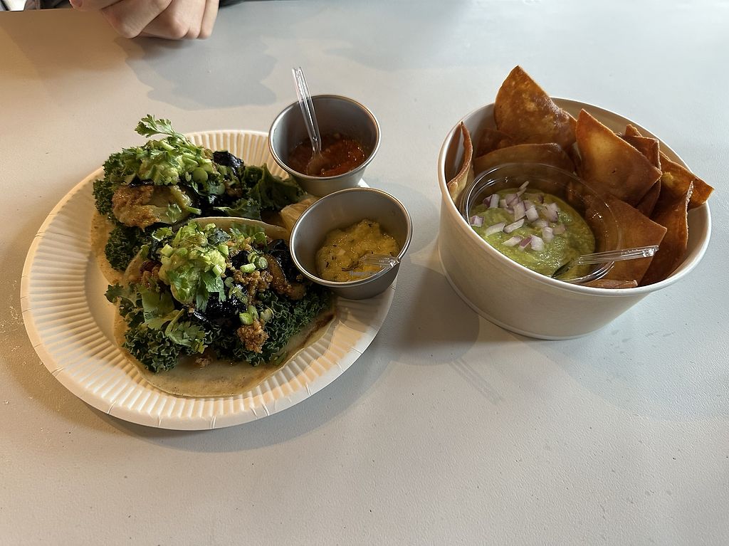 One of each type of vegan taco Orange sauce in the glass is nice and …