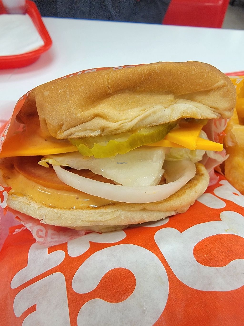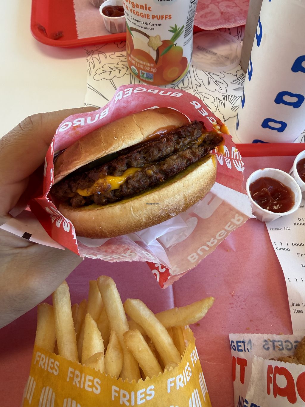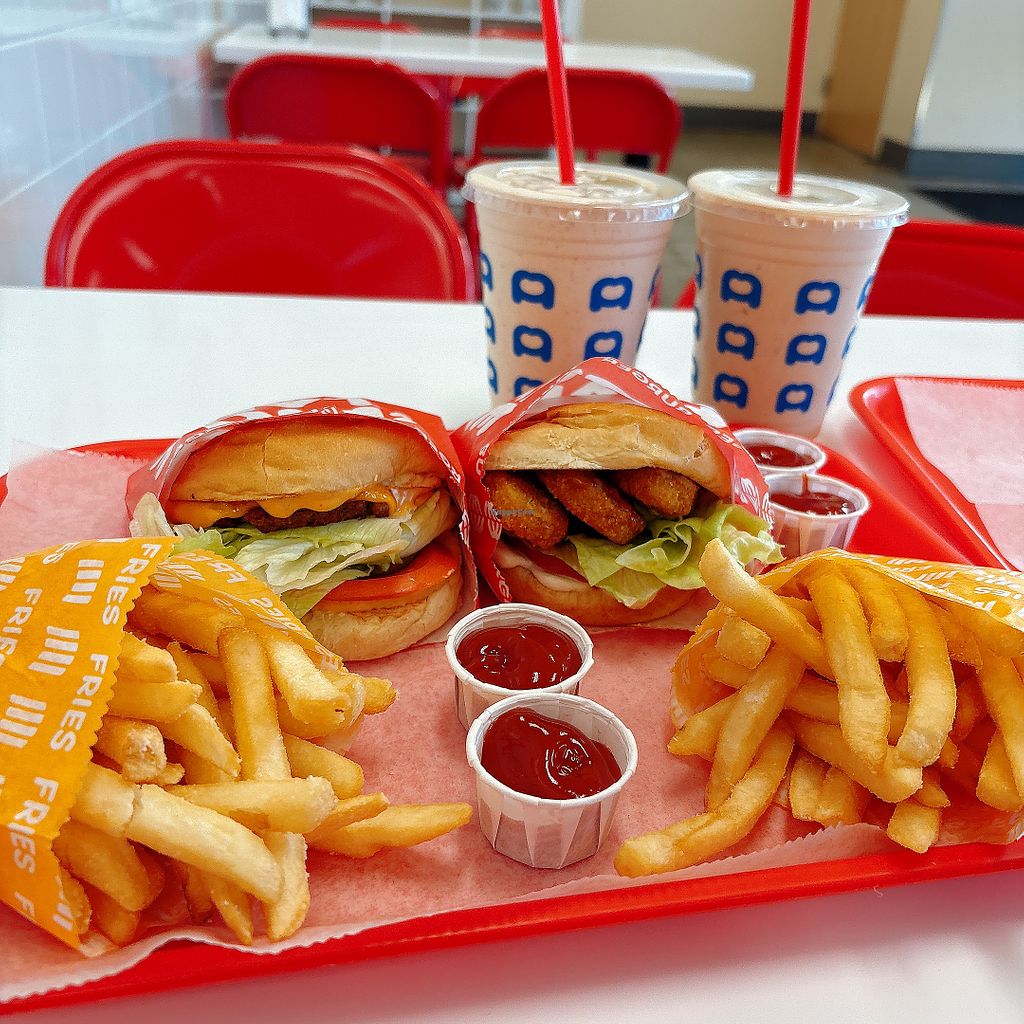 And if ya have kiddos, there are crayons and paper to keep them occupied. 🖍️Parking lot is huge and it's easy to eat in the car if the restaurant is full. Staff is kind, helpful, and friendly; food is just as quick as any burger joint. Willing to bet most patrons don't know or don't care that it's all vegan, the way things should be 😋