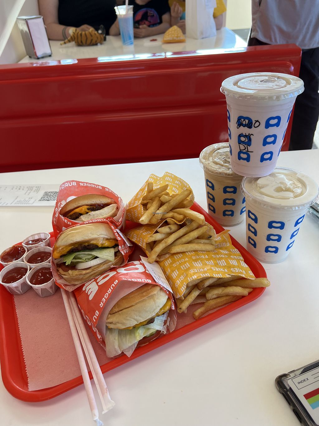 The Double Red & Yellow burger included two patties, cheese, ketchup, mustard, and pickles on a bun. It had too much ketchup and mustard for my preference, but it was still pretty good. The fries were crispy and salty. They were served with two little cups of ketchup. That was convenient, but I think it would be better to have a ketchup pump out so people can choose how much they want, if at all. The chocolate shake had a good flavor and consistency, but it started to melt quickly. It was served in a single-use plastic cup, and they wouldn't even let me order it without a lid and straw. Overall, I enjoyed the meal, but I probably won't return unless I'm nearby.