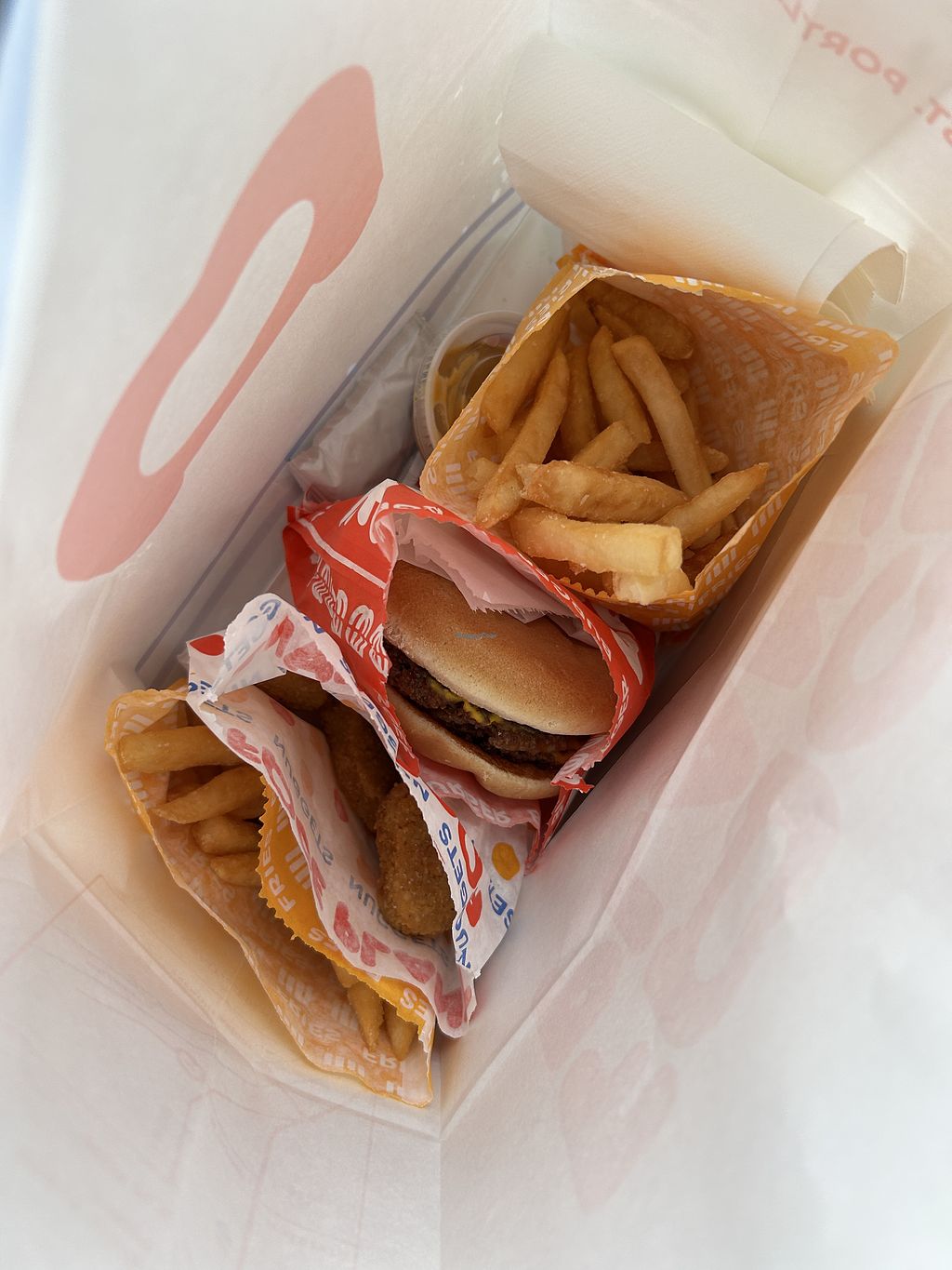 There were a million vegan spots we wanted to hit while in Portland and we ended up coming back here a second time because we enjoyed it so much. We actually ordered different stuff the second time and enjoyed it even more. We came and ordered inside the first time and all got the Double Fancy with fries. The fancy was good but by the end the meat was getting to us. The fries were good but they had a strong vinegar flavor. I didn’t really mind it but not sure why they wouldn’t stick to regular fries. The next day we went through the drive through and ordered the chicken nuggets, the fancy, and the red & yellow. The chicken nuggets were delicious and were salted to bring out the flavor. They came with a honey mustard type sauce that was delicious. The red and yellow was so good and really had the traditional McDonalds flavor. We skipped the fries and got a chocolate and strawberry shake instead. The chocolate shake was reminiscent of a frosty, and the strawberry was like a friendlys strawberry fribble (idk if friendlys exists on the west coast but it’s an east coast chain like Applebees but mostly for kids). Anyway, the shakes were delicious. Everything was so good and we can’t wait to return next time we’re in Portland.