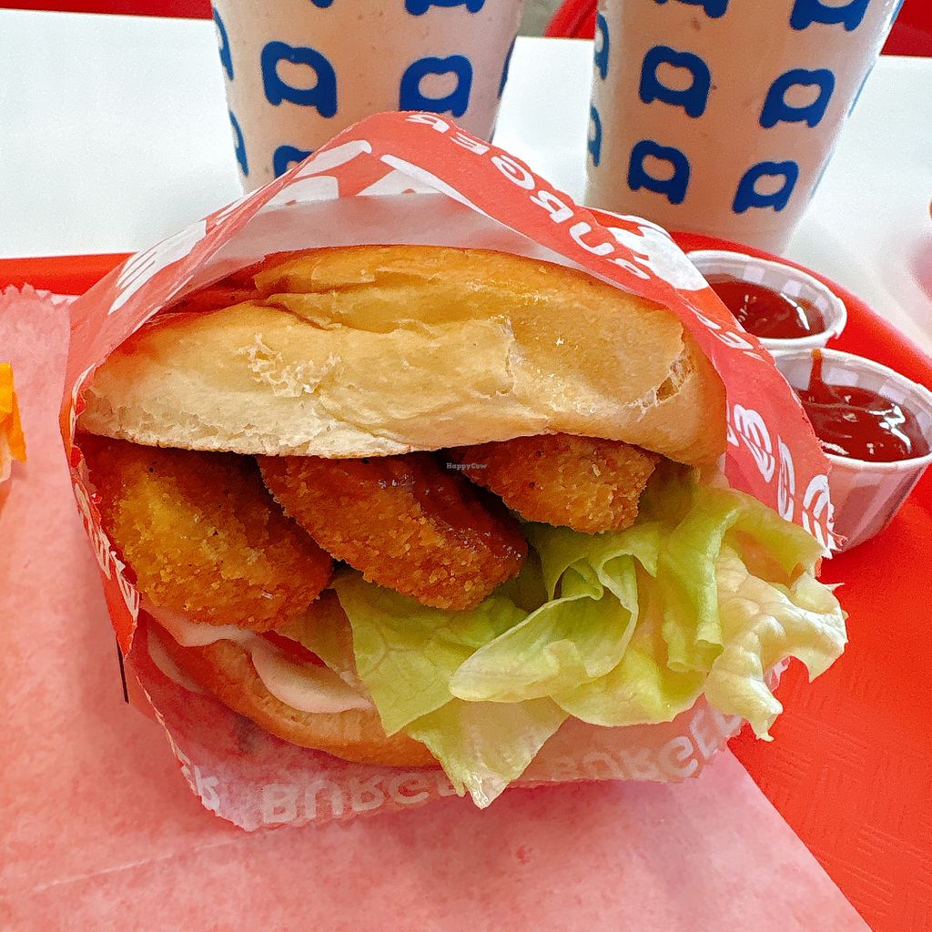 Joint was 90% full of customers; ya love to see that at a vegan spot! NUGGETS AND SAUCE FOREVER!! 🤤 The sauce is like a more flavorful hunny mustard. Burgers taste like McDonald's from your childhood. They've mastered the art of making vegan fast food! Simple menu just like your In-and-Outs with no substitutions; they're confident in what they do and they should be! Milkshakes "coming soon" as of this posting.