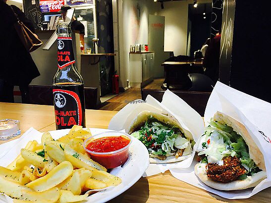 Serves meat, vegan options available. Finnish-based chain of pita sandwich bars. Offers a selection of labeled vegan sandwiches and salads made with falafel, faux chicken, cauliflower, hummus and vegetables. Also serves vegan sides. Reported closed February 2025.