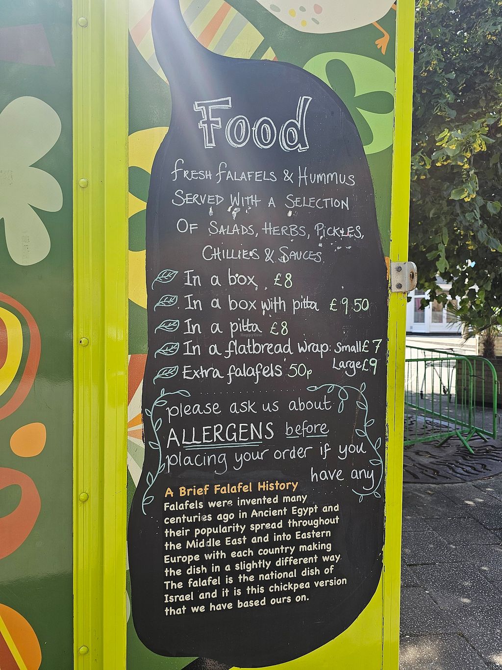 The falafels were OK, but took much too long to serve, especially for a street food van. This is possibly because there's too much going into the meal: as well as falafels, there were pickles, chillies, salad, hummus, sauces; and it's possibly because the serving staff need to understand how division of labour works.
