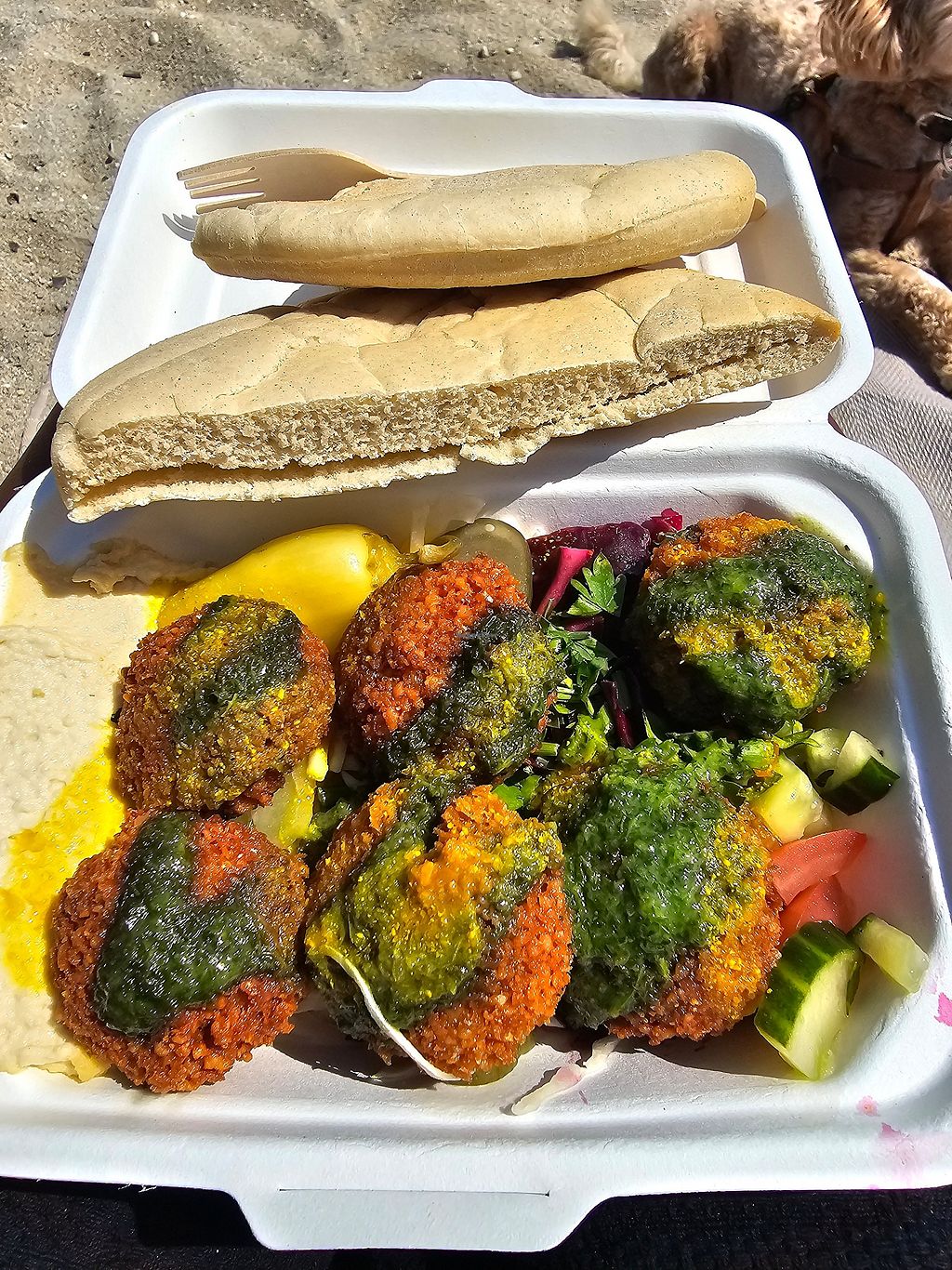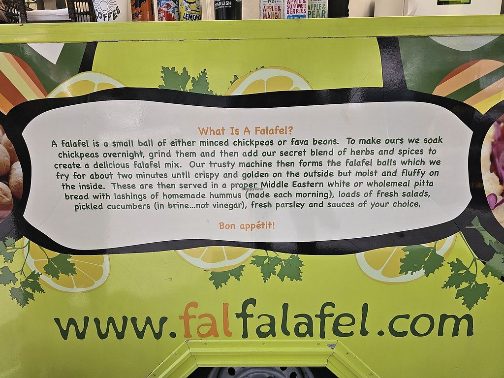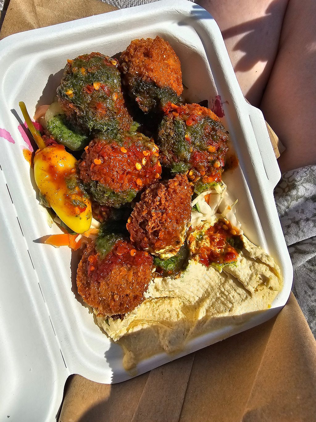Middle Eastern vendor operating from a catering trailer offering vegan falafels, hummus and salads. Open Tue-Sat 11:30-16:00. Closed Sun-Tue.
