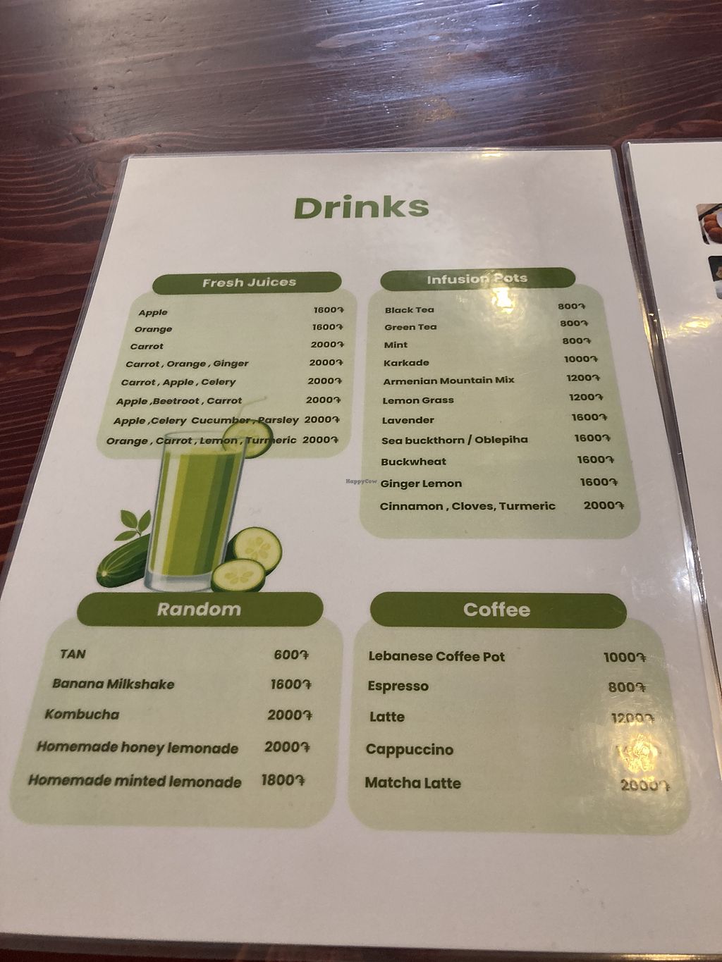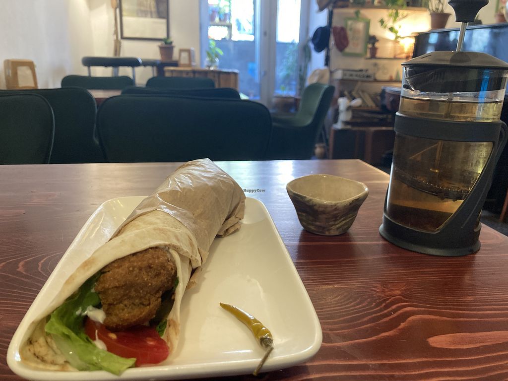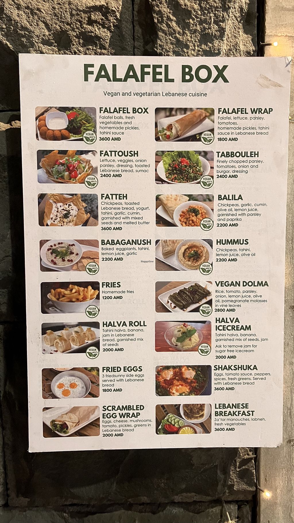 This place is cozy, fully vegetarian and has plenty of vegan options. I decided to opt for the falafel wrap (now mind you I haven’t eaten any other falafel in Armenia at all) but compared to the Western European standards I am used to, the taste is okay, not the best I’ve had and definitely not the worst I’ve had. It was just a decent falafel roll, for an affordable price. I went around lunchtime 13-14 on a Monday and it was not busy. For Yerevan, it’s a decent place with plenty of clearly labeled vegan options. Their tea tastes good too. Service is good.