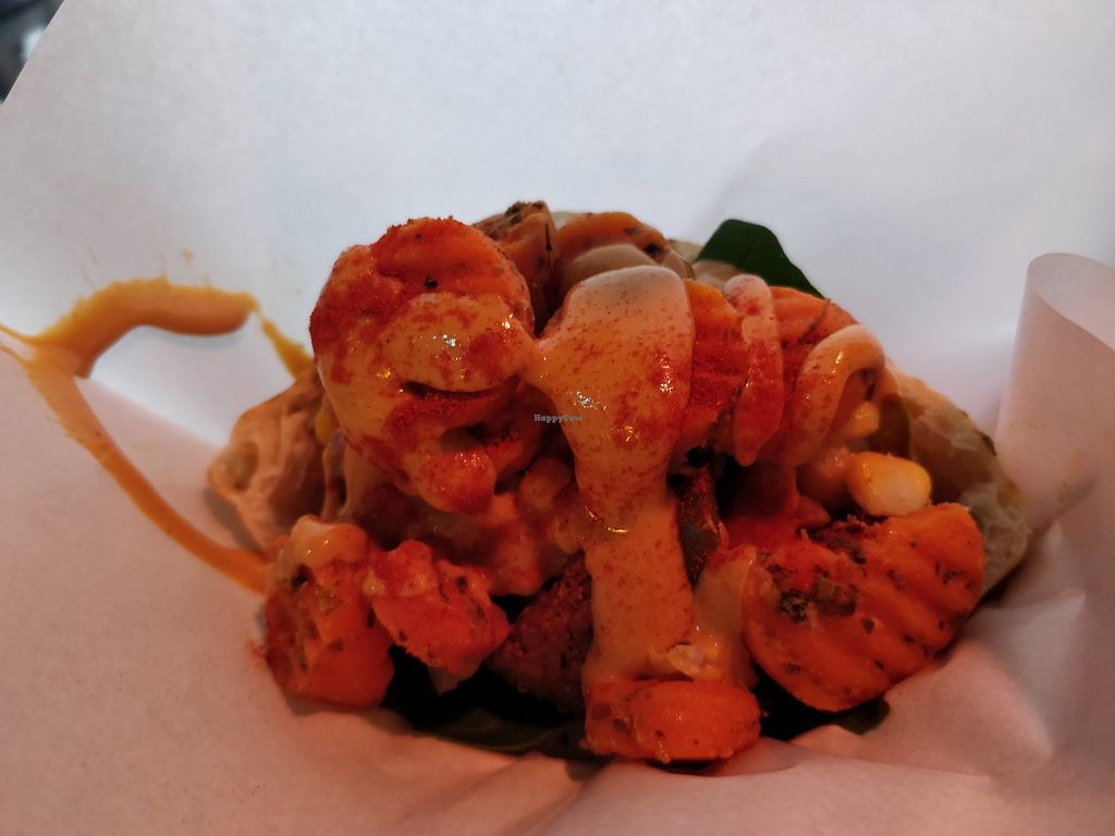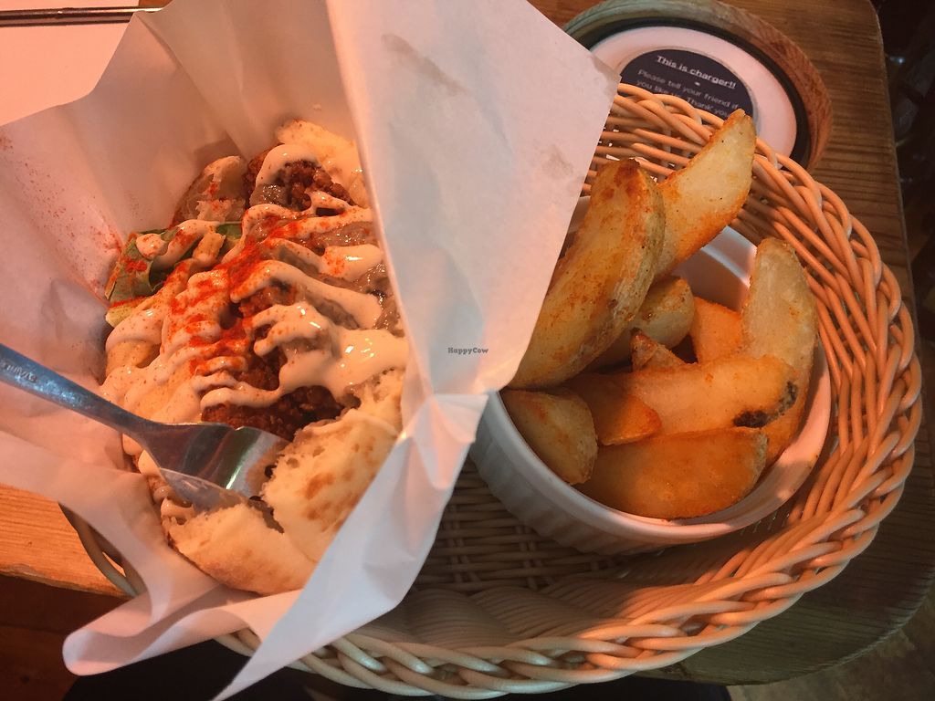 The menu is very customizable. Like a vegan falafel Subway. I love that I can add lots of veggies and choose my sauce. Price is fair. Many locations with slightly different menus. Waffle fries are fantastic.