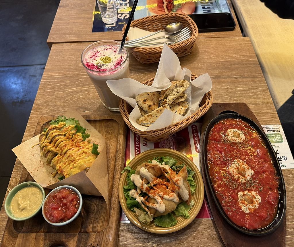Read moreCheesecake with berry sauce, samosa, and shakshouka were all great. The hot dog was just okay and messy to eat.