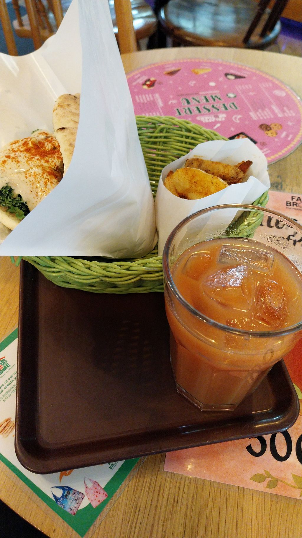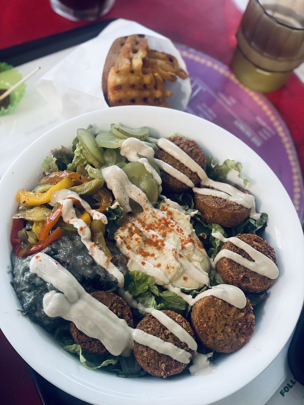 Guava juice, waffle fries and Mediterranean falafel rice bowl