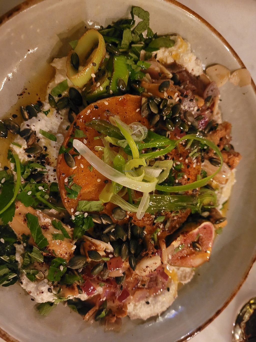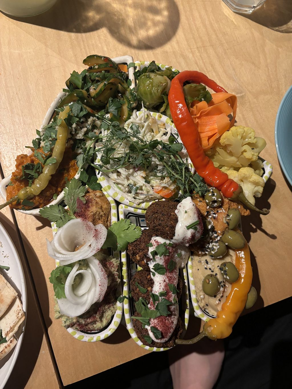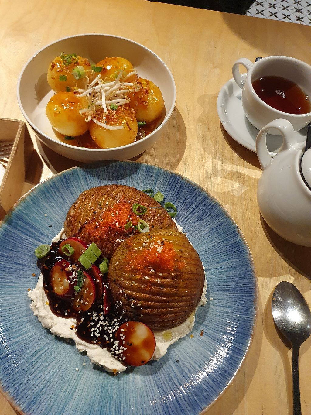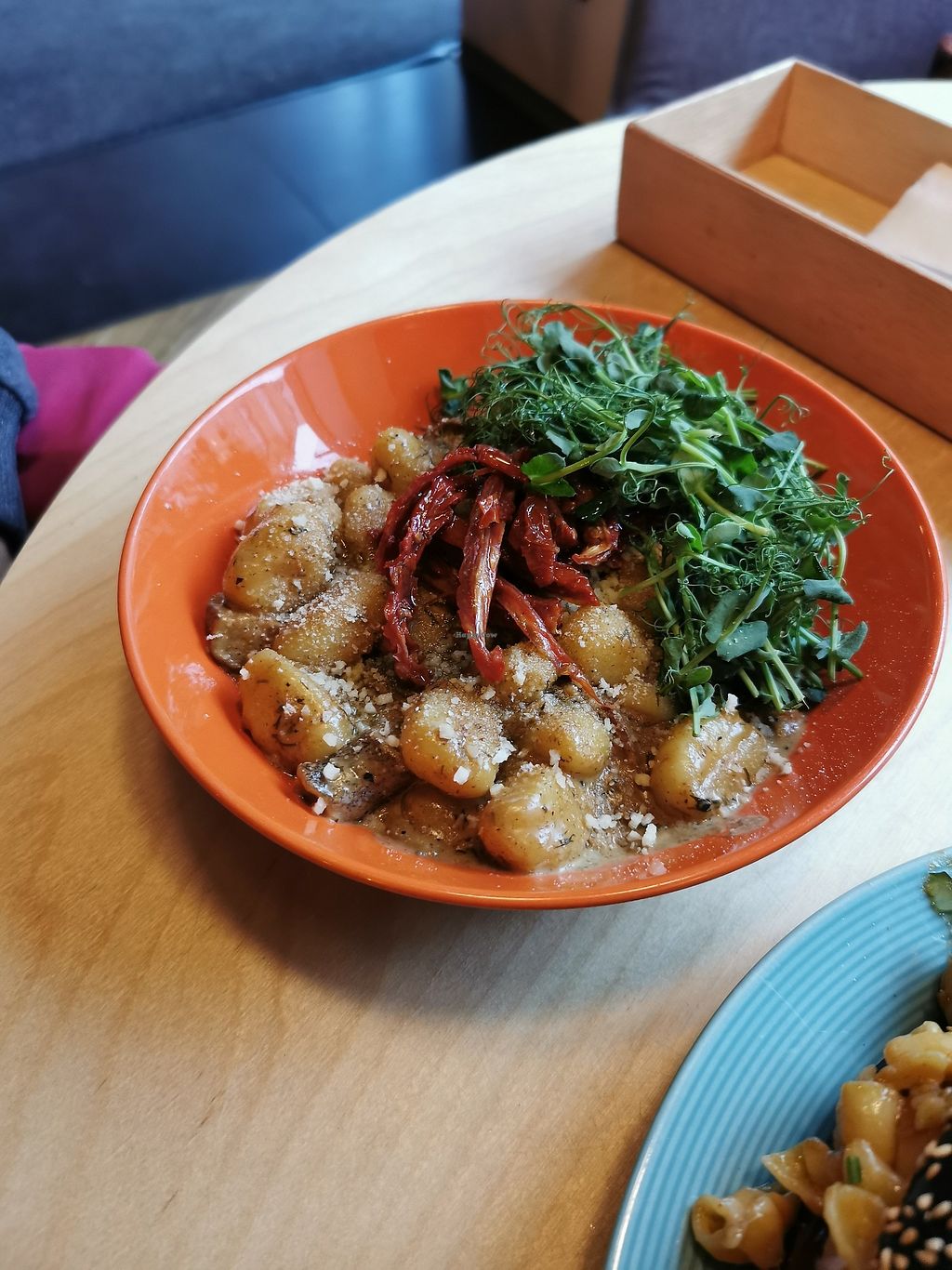 Wzięliśmy dwa dania główne- jedno z menu sezonowego (kopytka z rydzami, 5/5), drugie z menu standardowego (bakłażan z tel avivu, 4/5). Zupełnie inne smaki, oba naprawdę smaczne, jedyny zarzut to oczekiwałam że bakłażan będzie w bardziej słodko-ostrym sosie, a podany sos przypominał mi bardziej bbq. Obsługa uprzejma, ładny wystrój i duży wybór.