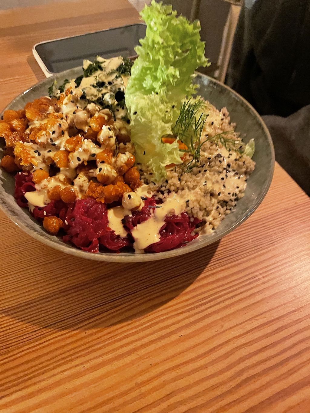 Fully vegan place with an outside area away from the street, a few steps from an S Bahn station. They have a decent fixed selection and a handful options on a changing menu. Went for a small salad and small soljanka (East German/Eastern European/Russian sour Goulash-like stew?), was both perfectly fine, although I have to say that 9,40 for a small starter salad is a bit excessive.