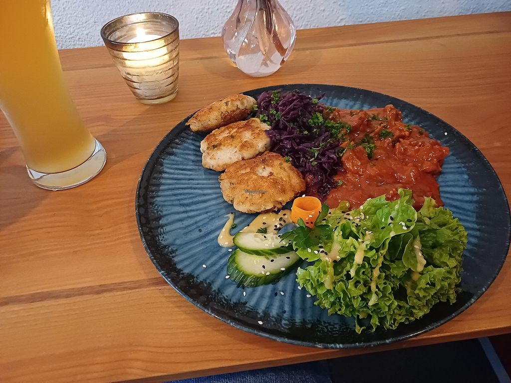 They offer typical vegan German food. We had the starter plate for 2 and were absolutely amazed. It was already a lot so it we had trouble to finish the main dishes, which were really good but a bit pricy. They also offer deserts.