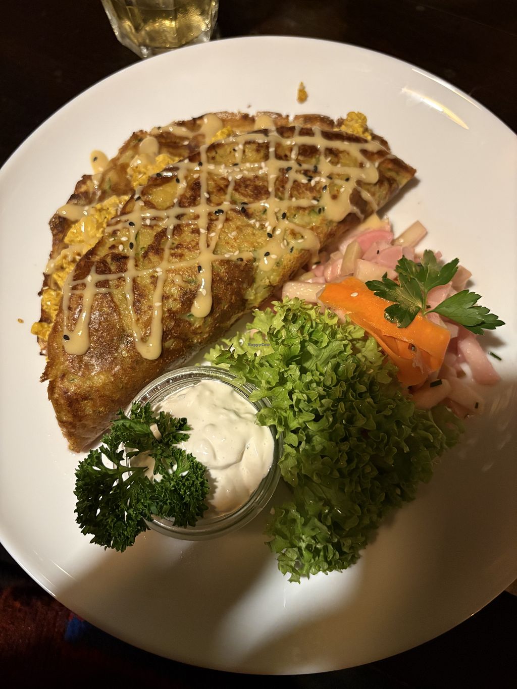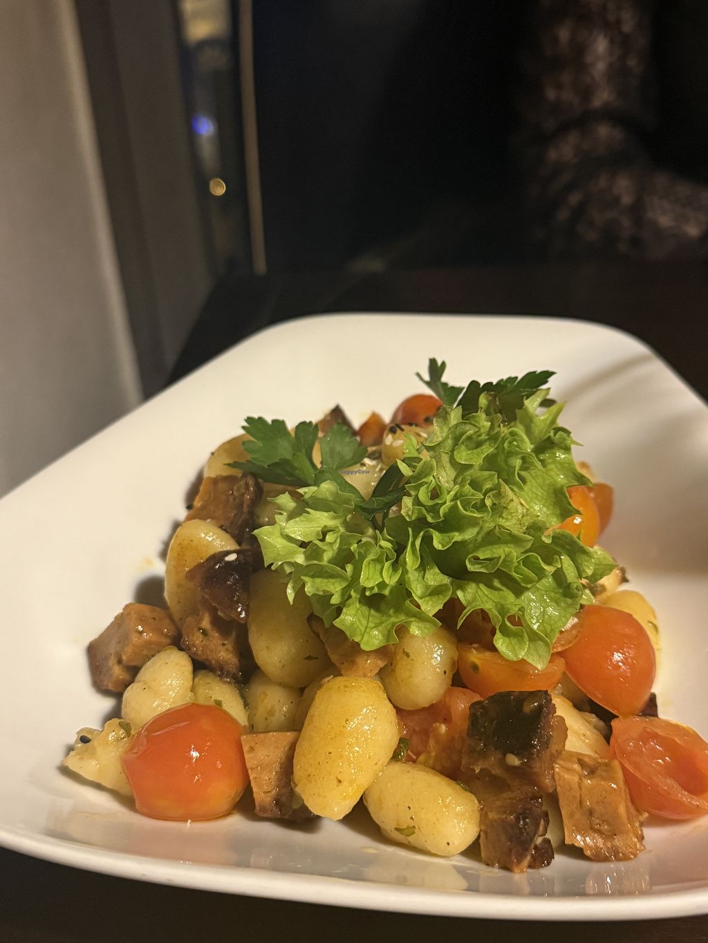 We hebben lekker gegeten in dit restaurant. Helaas hadden wij niet gereserveerd en we moesten buiten zitten op een harde houten bank, terwijl het best wel fris was. Maar we hebben doorgezet. Partner had een Plins gevuld met cantharellen in een romige saus en ik had pasta met seitan blokjes en een tomatensaus. Het was lekker, vooral de seitan blokjes. Partner was zeer tevreden met zijn plins.