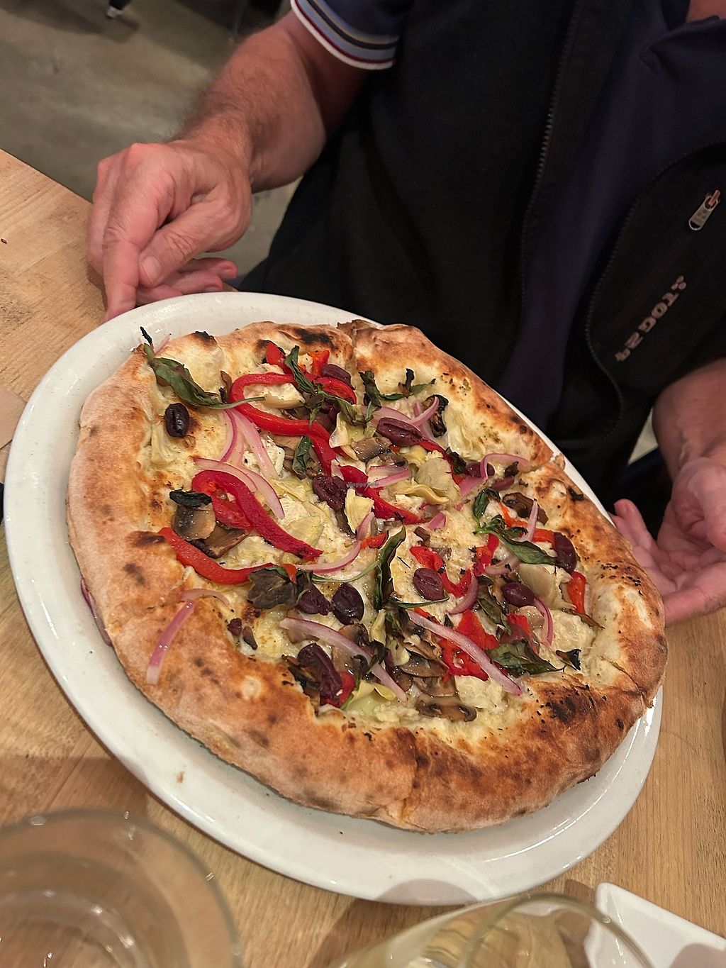 Build your own pizza: red sauce, Daiya cheese, mushrooms, brussels spr…