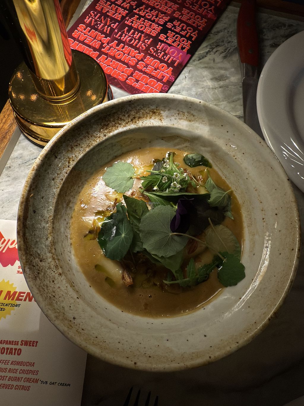 Might be the best fancy meal I have ever had! They had 6 vegan meal options (you choose 3 per person!) and vegan dessert. There was vegan palette cleansers, complimentary drinks, etc. I can not recommend enough for a nice night out! The menu is always changing and supposed to be a surprise, but I did post a picture— avert your eyes if you want to keep the mystery!!