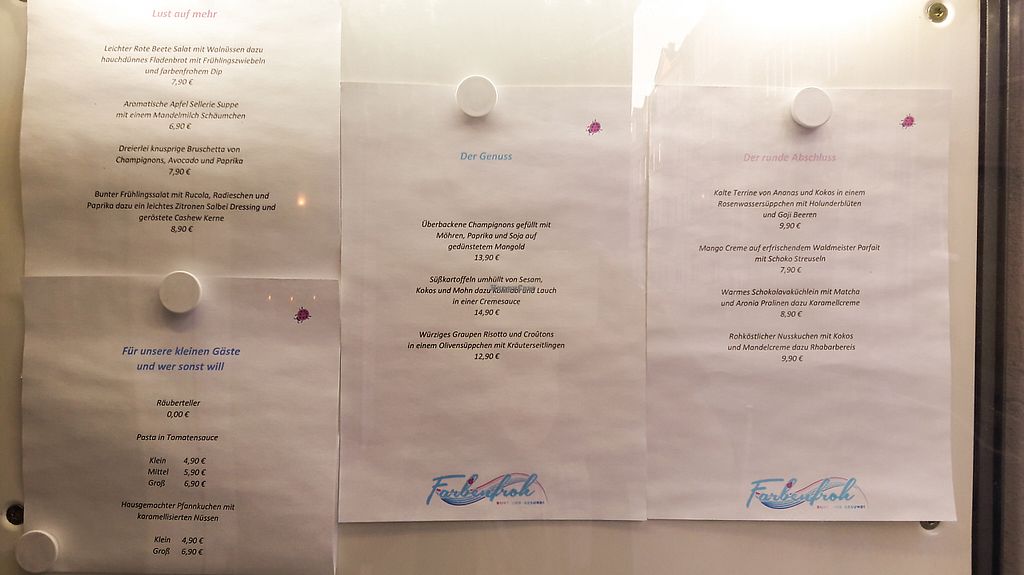 Wir waren schon öfters im Farbenfroh. Für mich ist es eines der besten veganen Restaurants in Deutschland. Hochklassige Gerichte und tolle Weinempfehlungen. Es ist nicht günstig, aber das Preis-Leistungs Verhältnis stimmt vollkommen. Das aktuelle Menü findet man immer auf der Website.