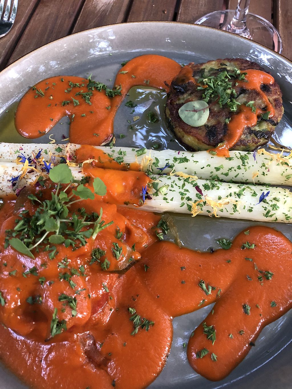 Since we were visiting Essen, we looked on HappyCow for a restaurant recommendation there. The menu itself was like opening a small book with their dishes and beverages. I mention that because laminated menus tell me the food never changes. The food at Farbenfroh changes with the seasons, with a special menu changing weekly. It was hard to choose because everything looked so good. We ended up ordering the 3 course menu with wine pairings. Everything was delicious and a feast for the eyes. The food was wonderful, the wines paired deliciously. All the wines were from German wineries.