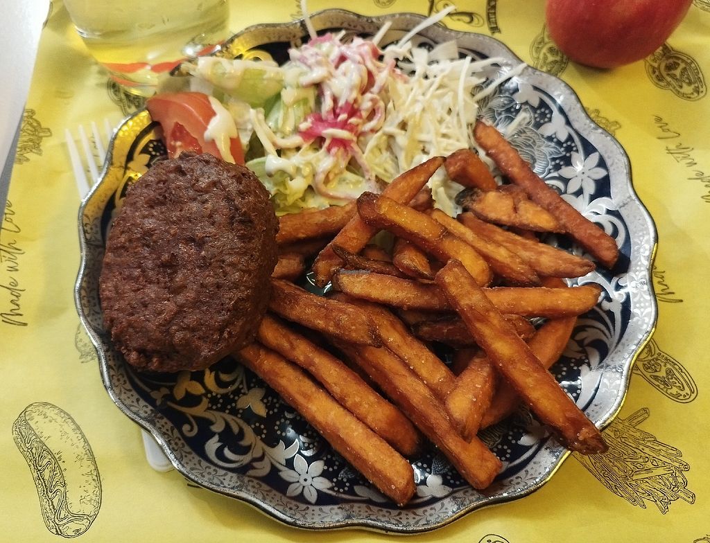 Vegan cheeseburger, sweet potato fries, vegan mayo