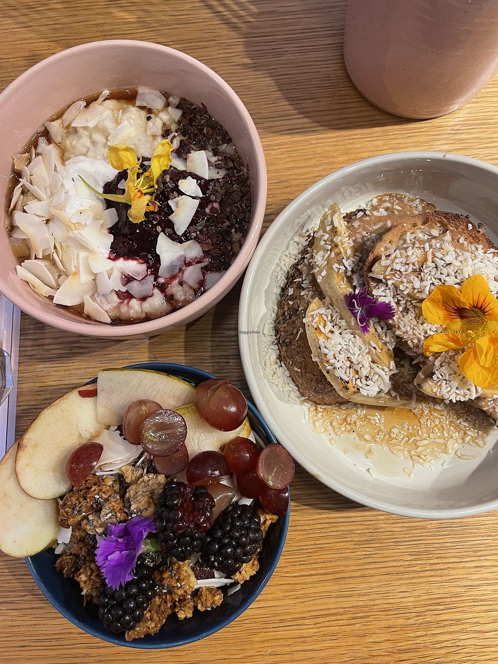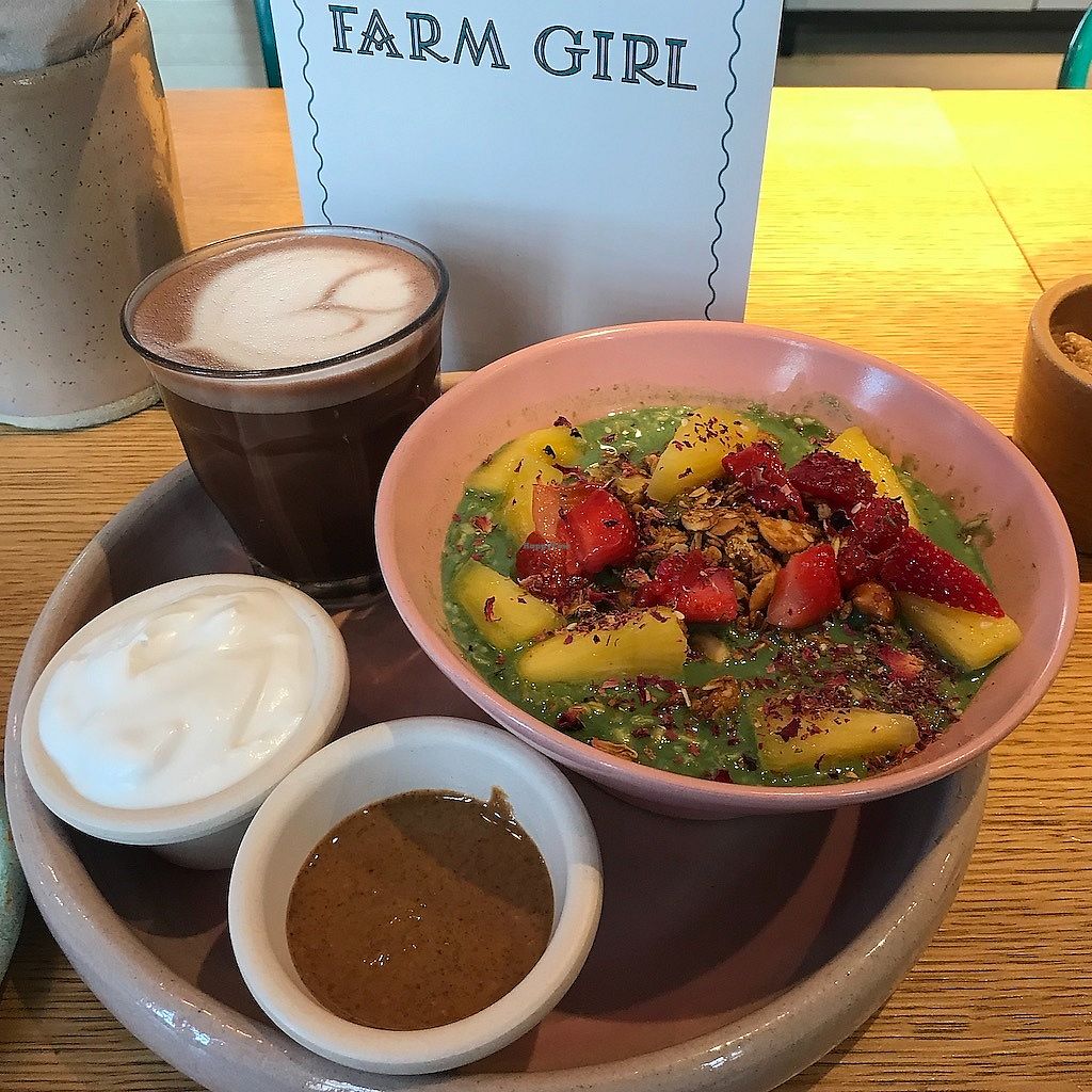 Almond butter and banana toast with Earl Grey. Farm bowl with sourdoug…