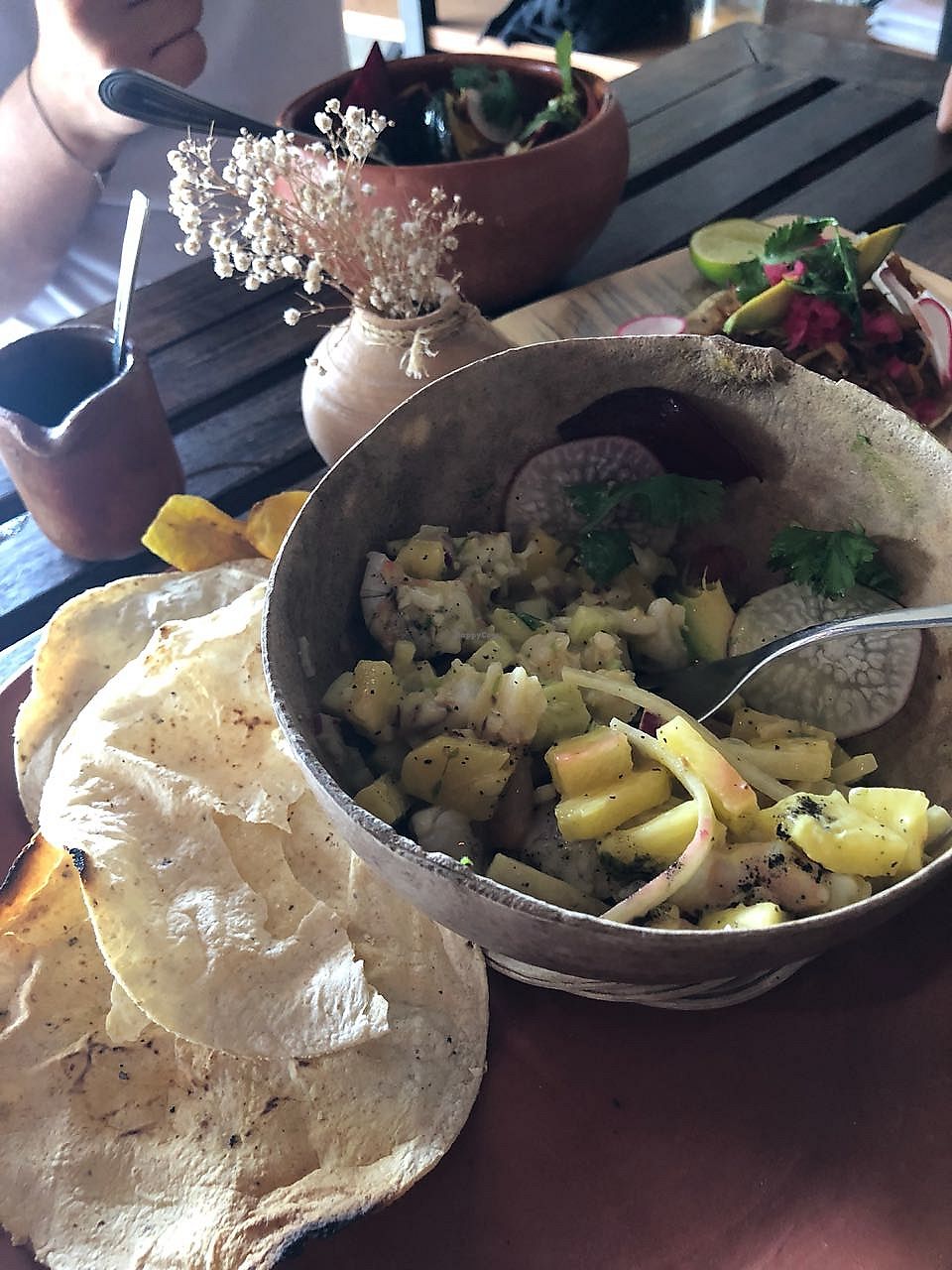 Super great vegan tacos, guacamoule, mango cerviche, and hummus
