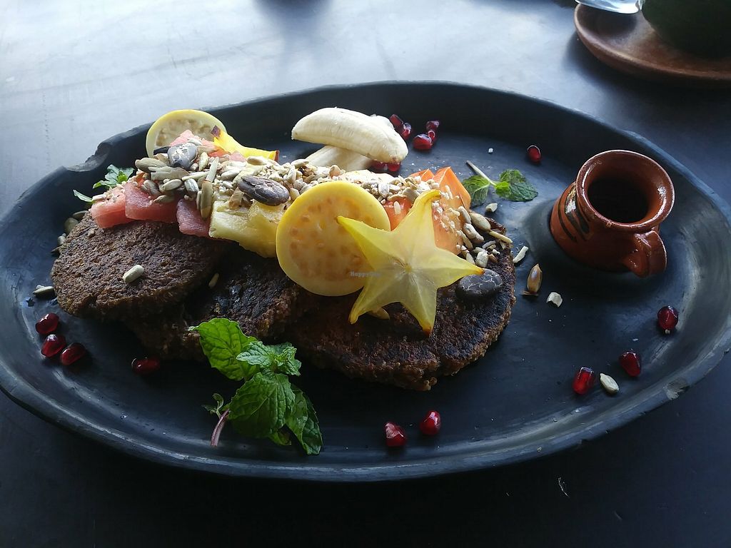 Vegan Mayan seed with plaintain and coconut pancakes. Fresh fruit, syr…