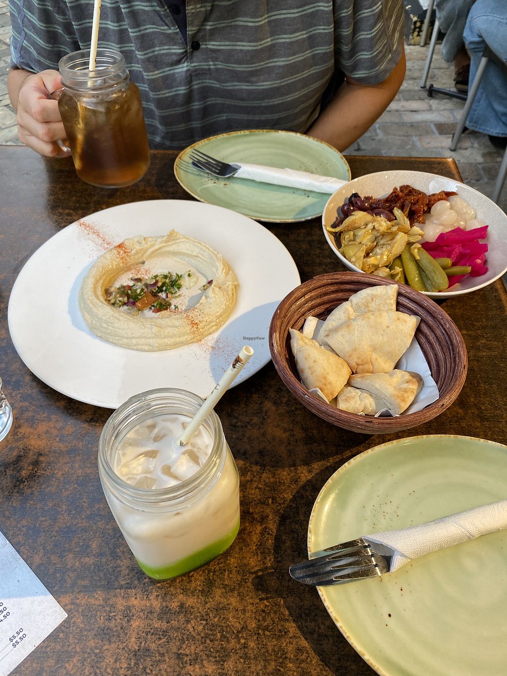 Pickle plate, hummus plate, apple tea & chai