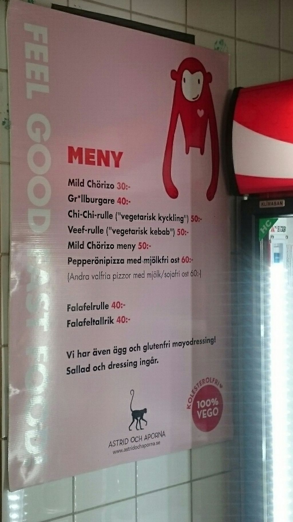 Serves meat, vegan options available. Fast food restaurant with a separate vegan menu by Astrid och Aporna including vegan pizza, kebab, vegan burger, falafel and vegan mayo. Removed Aug 2018 - restaurant for sale and vegan options limited. Please note that many businesses in Sweden are cashless.