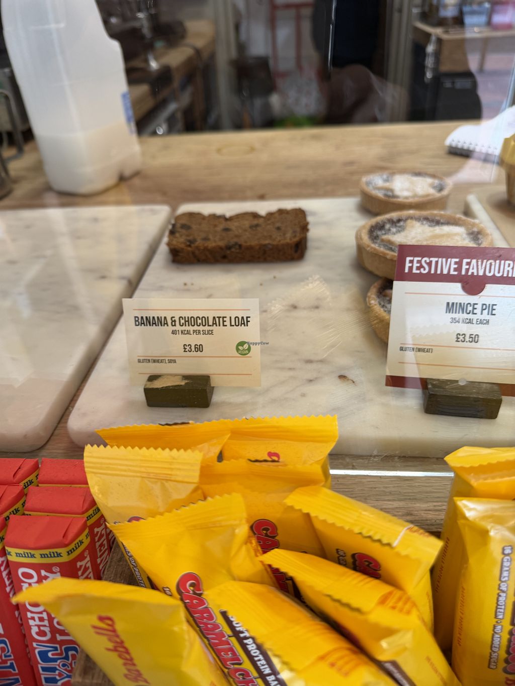 Sproud milk has no extra charge which is nice. 40p extra for oat milk. Regularly changing coffees and also packs of coffee for sale. I was impressed to see a decaf bag and 2 different natural processed coffee for sale. The almond pain au chocolat look great for vegetarians.