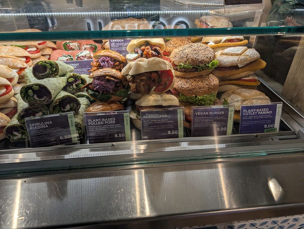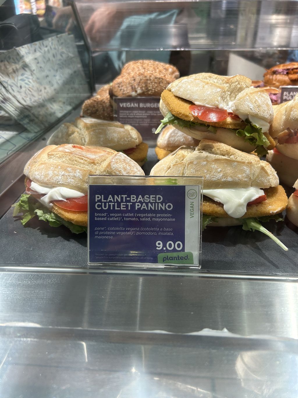 There are two Natoo at FCO, in T1 and in T2. Quite a few sweet & savoury vegan options & plant milks. I tried their sandwiches, passion fruit smoothie and salad bowls. Very yummy! Particularly the plant based chicken bowl